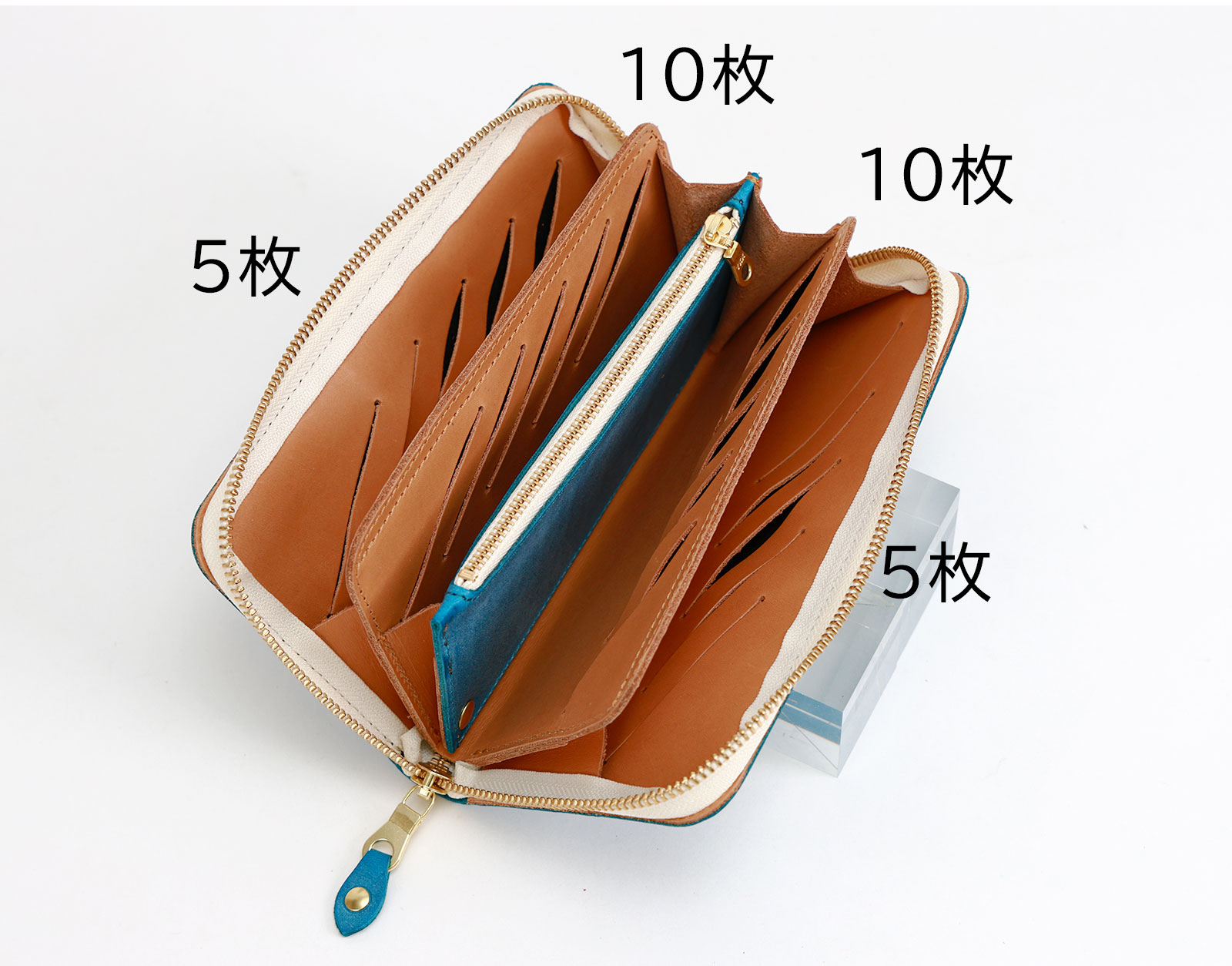 革を半分に折り、切り込みを入れた「スリット」でカードを収納します。