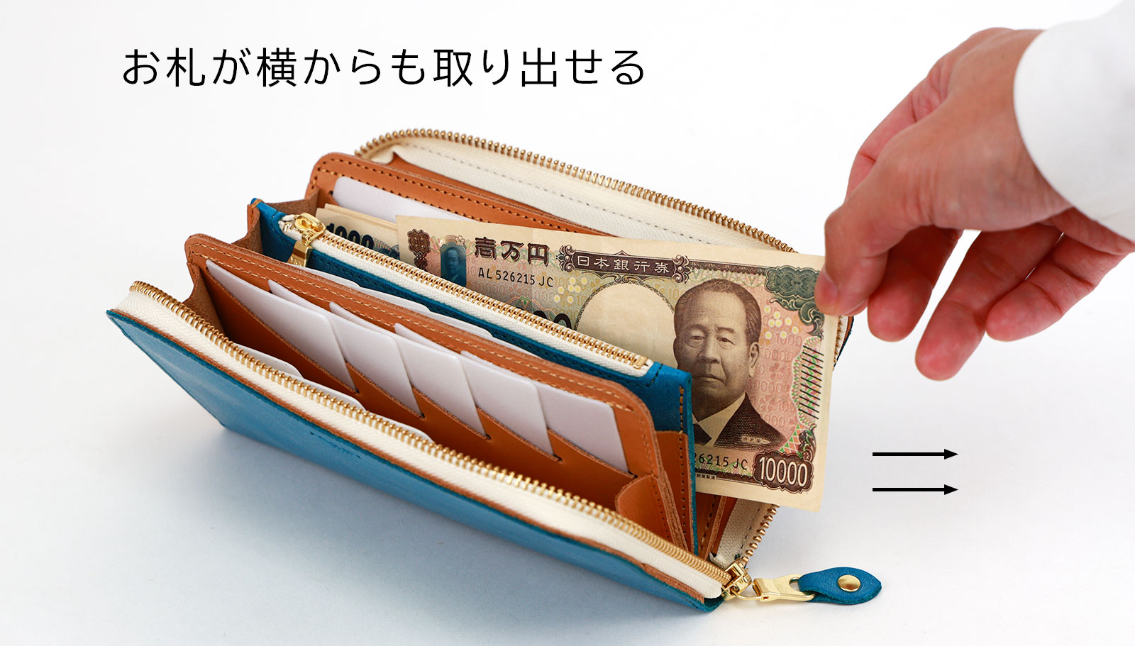 通常の長財布は、上からしかお札が取り出せませんが、マチを外す事により横からもお札を取り出す事が出来ます。