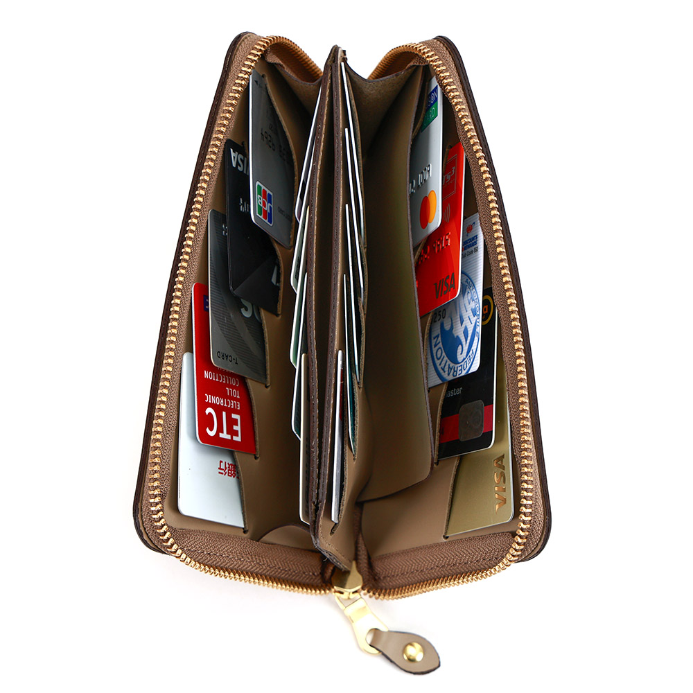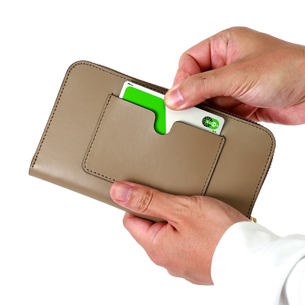カードが取り出しやすいよう、縦に整列するカードスリットが特徴の長財布です。 内側には20枚、外側に1枚、計21枚のカードが収納可能。 多収納ながら厚みを最小限に抑えるために、独自のカードスリットの構造を採用しており、カードの出し入れをしやすくするために、斜めのカッティングにしています。 小銭入れはオープンタイプ。取り出しやすくするために中央上部に浅めに取り付けました。 本体ファスナーを閉じた状態なら振っても他のスペースに飛び出さないように、小銭入れの高さを微調節しました。 小銭入れと本体壁の間のスペースにはお札が折らずに入ります。札が取り出しやすいよう、サイドのマチを1ヵ所外しています。札入れの仕切りはお札の種類を分けたり、フリーに使えます。外側のポケットにはICカードなどを入れておけばそのままタッチができます。 想定容量 カード21枚/小銭20~25枚/札20枚 ■素材:牛革/■サイズ:W18 × H10 × D2(cm)/■重量:約140g/■日本製【カードがたくさん入る財布 / 長財布 / ラウンドファスナー / 21枚 / コンパクト / メンズ / レディース】