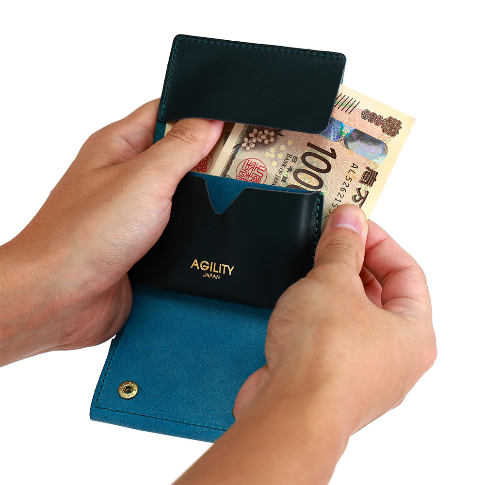 - 紙幣は10枚程度まで収納可能。 右利きの方が使いやすいよう、右開きになっています。