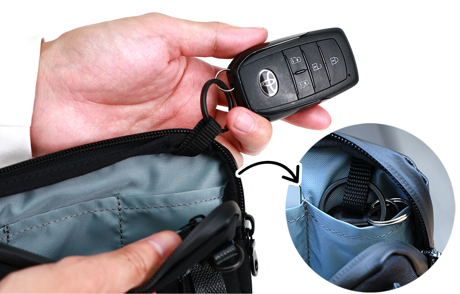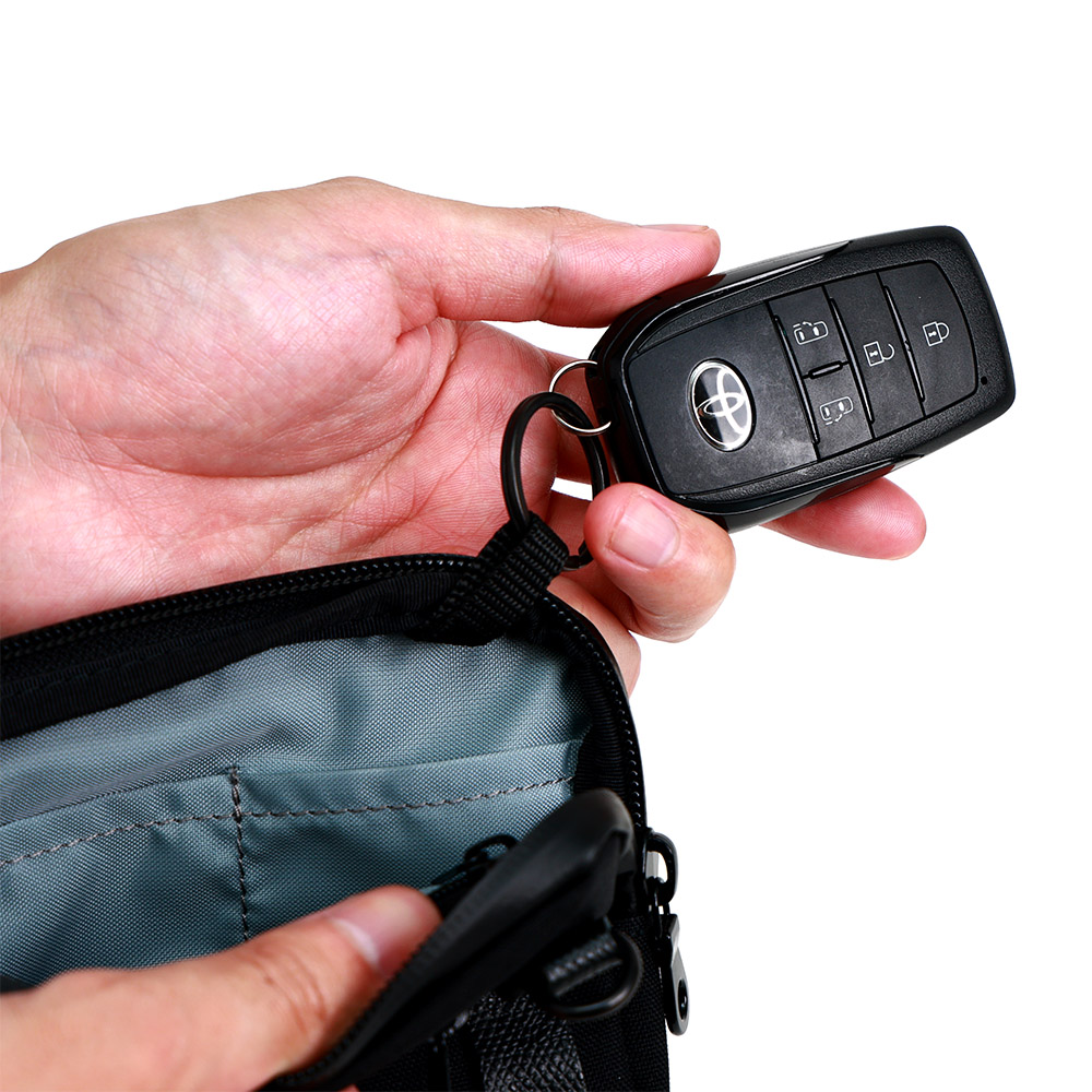 キーリングに取りつけた鍵は、垂らすようにして専用のポケットに収納すれば鞄内で他の荷物と触れることもなく傷もつきません。
