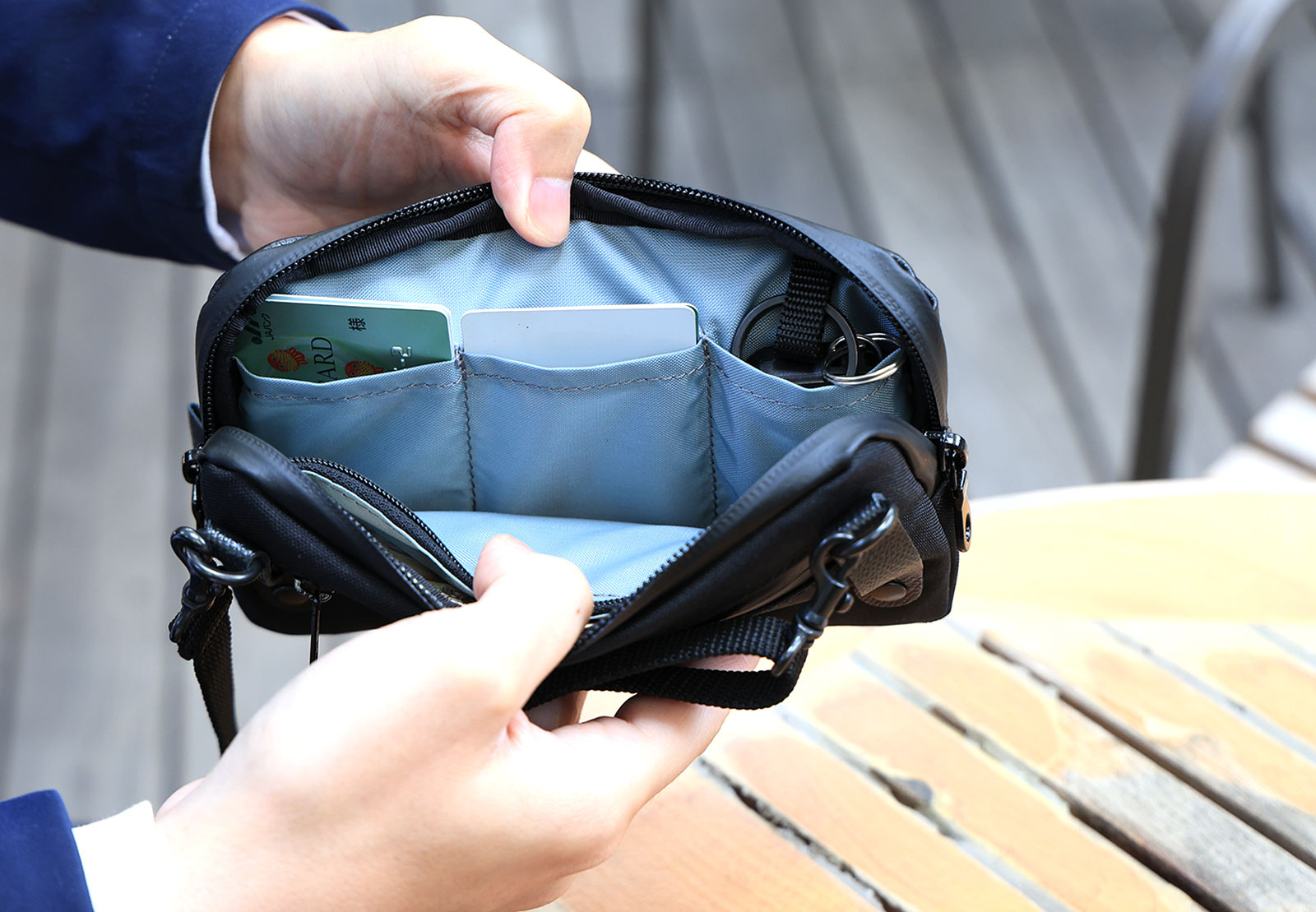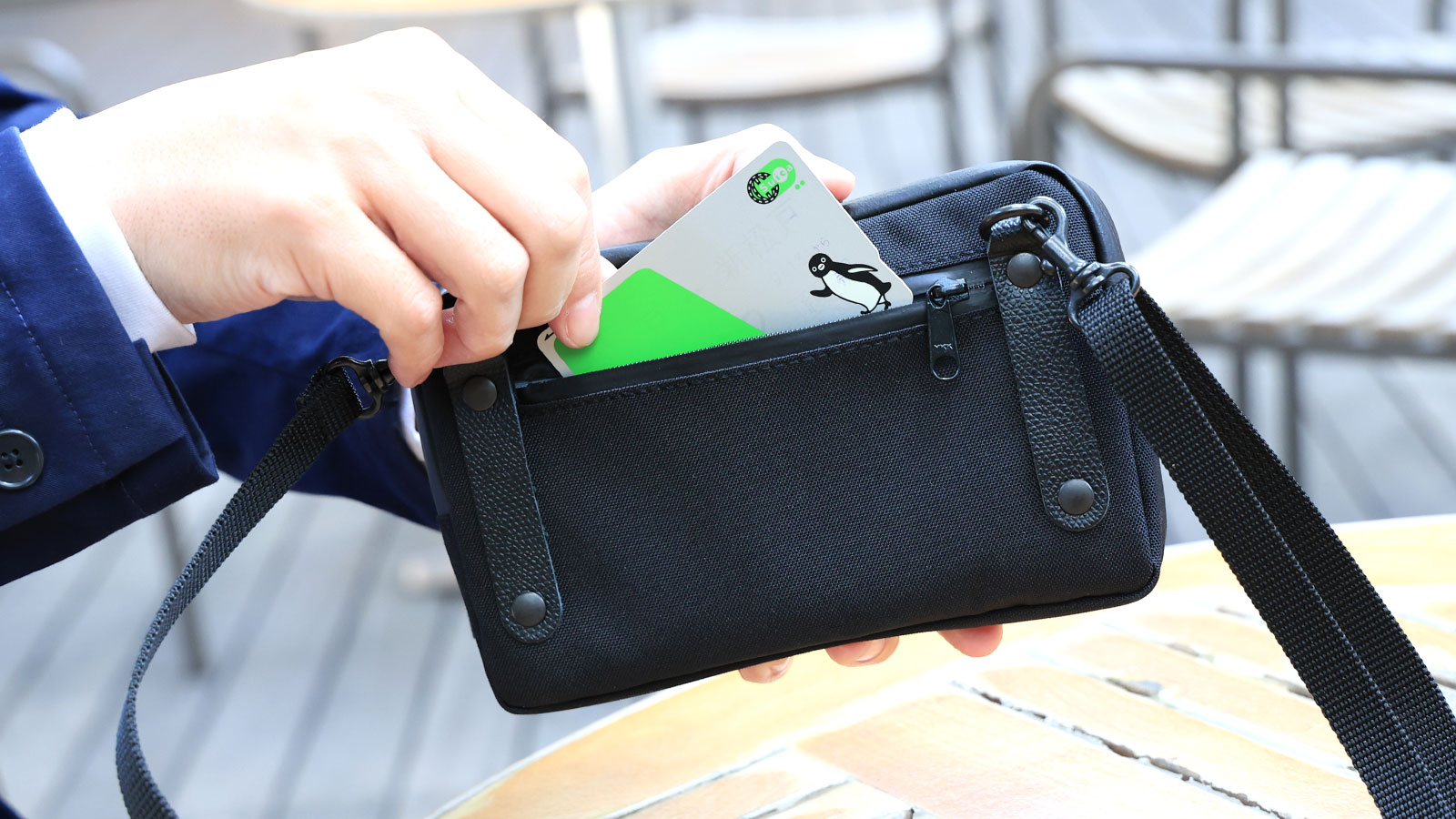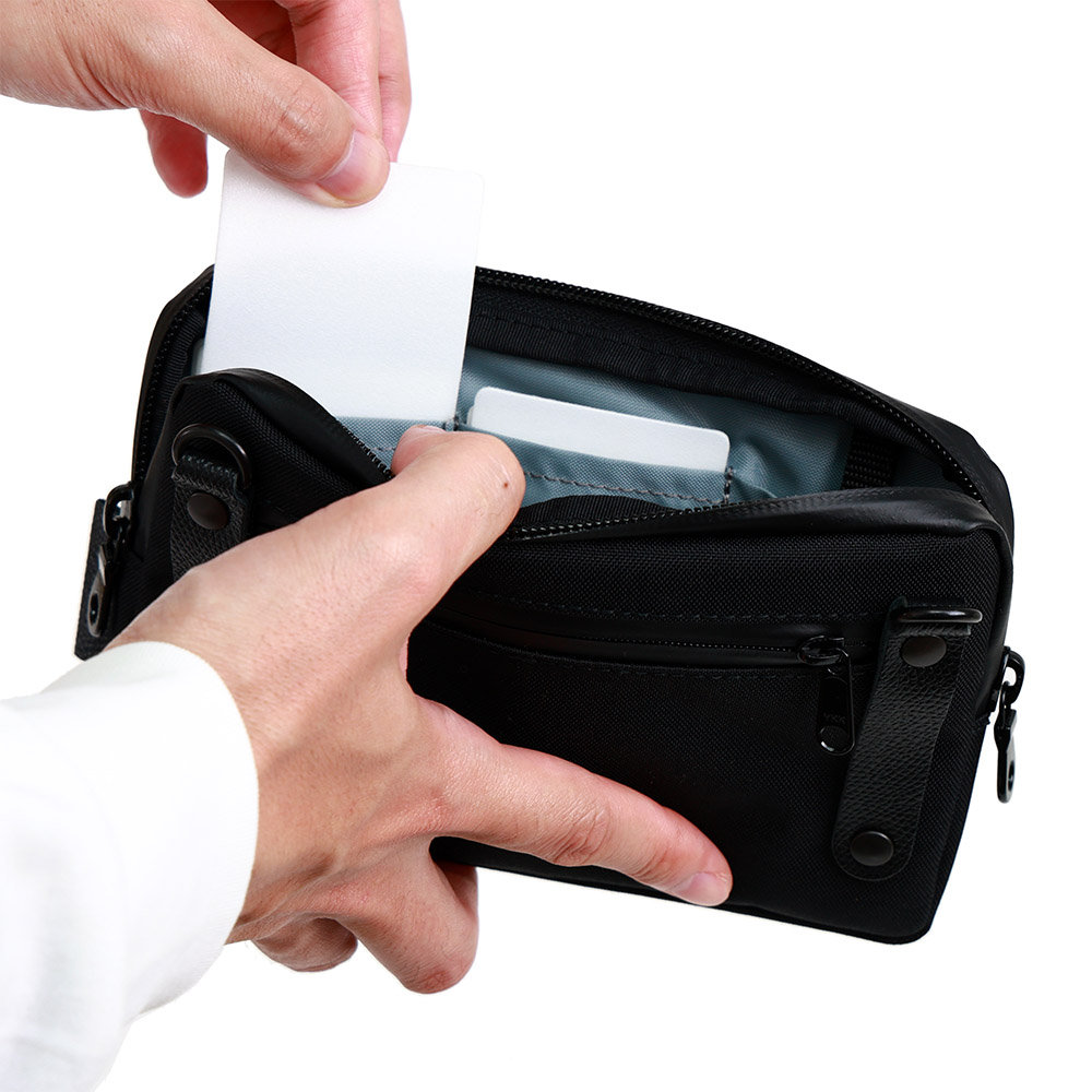 - 背面側のファスナーポケットはカードサイズ。ICカードは入れたままでもリーダーにかざせます。