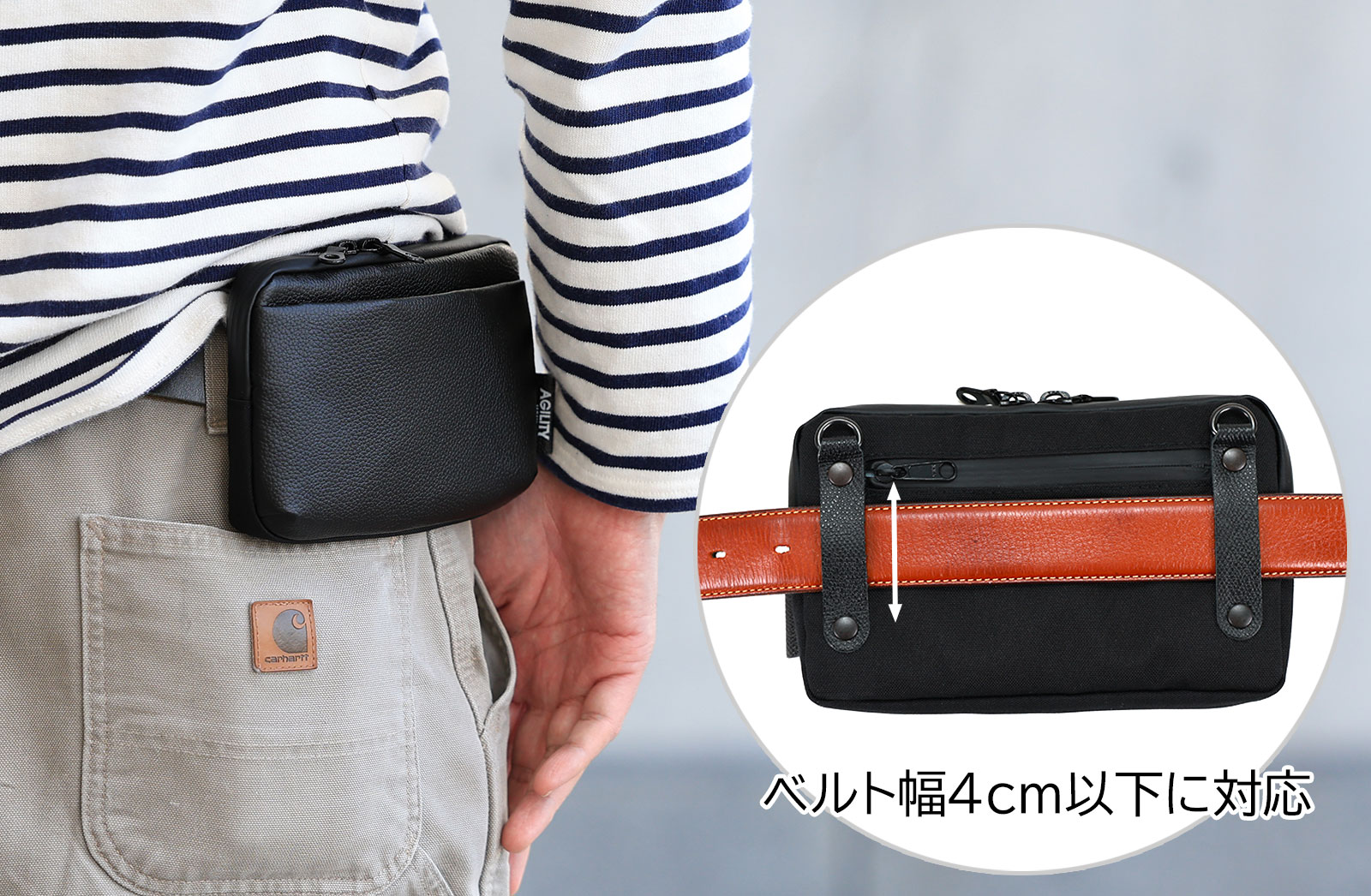 付属のショルダーベルトを外して背面のループにベルトを通せば、ベルトポーチのように使えます。