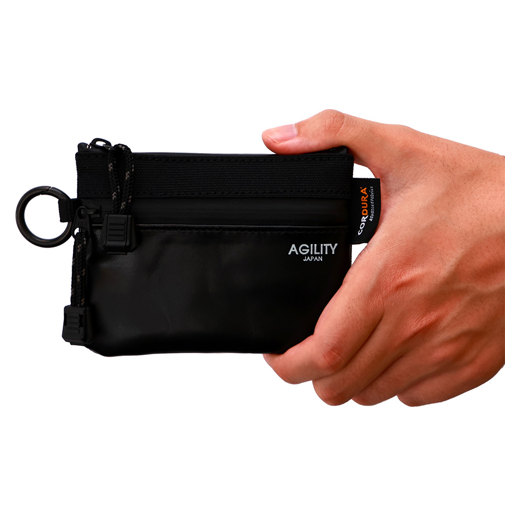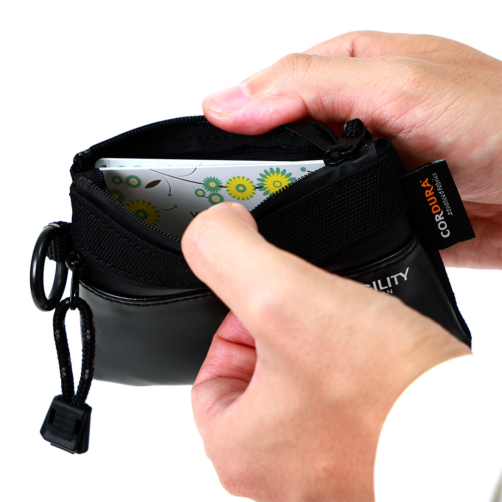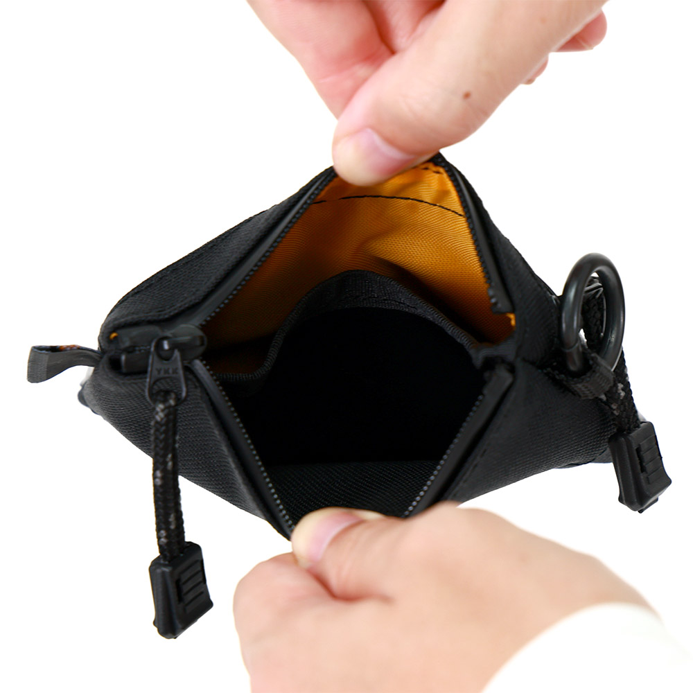 キャッシュレス時代に辿り着いた次世代ポーチウォレットです。 【タフ×機能性】武骨なワークテイストを撥水ハイテク素材のコンビで都会的なイメージに仕上げました。 カードサイズのファスナーポーチをペースに撥水スムースレザーと撥水コーデュラ®ファブリックを用い、「タフで永く使える」 をコンセプトに「財布として使えるポーチ」を開発しました。 外側の浅いファスナーポケットには小銭が20枚程度入ります。(小銭を入れないときはカード収納可)本体トップのファスナーを開けると、奥には浅めの仕切りがあり、カードが5~6枚程度重ねて収まり、浅いので出し入れがしやすくなっています。 本体深いスペースには2つ折りにしたお札が入ります。もちろん財布としてだけではなく、小物用ポーチとしても使えます。撥水スムースレザー×撥水コーデュラ®ファブリック×YKK止水ファスナーのコンビで、表面は水をはじき急な雨やアウトドアなどでも重宝します。(完全防水ではありません)サイドについているリングカラビナは自由に着脱ができ、バッグやパンツに提げたり、ネックストラップなどにつければネックウォレットに、先端に鍵をつけたりと自由に機能拡張ができます。 ■素材:ナイロン・牛革/■サイズ:W12×H9×D1.5(cm)/■重量:約40g/■日本製 【財布 / ミニ財布 / カラビナ / 吊るす / ポーチ /ミニポーチ / 撥水 / キャッシュレス / 小さめ /コンパクト】