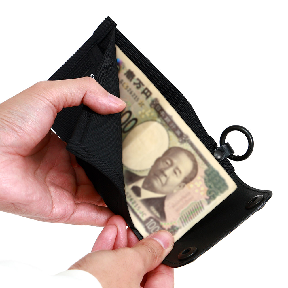コンパクトに仕上げた撥水素材コンビの3つ折り財布です。 【タフ×機能性】武骨なワークテイストを撥水ハイテク素材のコンビで都会的なイメージに仕上げました。 縫製箇所を減らし折り紙のように折りたたむ構造で作ることで無駄なスペースを抑え、コンパクトに仕上げています。 外側のファスナーポケットには小銭が10~15枚程度収納可能。 フラップを開けると内側には2つのカードポケットがあり、それぞれ3枚程度のカードが重ねて収納できます。 カードの後ろ側のスペースには10枚程度のお札が折らずに入ります。上部についている革のタブ(カラビナ止め)に、お札を分けて挟むことができます。 撥水スムースレザー×撥水コーデュラ®ファブリック×YKK止水ファスナーのコンビで、表面は水をはじき急な雨やアウトドアなどでも重宝します。(完全防水ではありません)サイドについているリングカラビナは自由に着脱ができ、バッグやパンツに提げたり、ネックストラップなどにつければネックウォレットに、先端に鍵をつけたりと自由に機能拡張ができます。 ■素材:ナイロン・牛革/■サイズ:W9×H7.5×D3.5(cm)/■重量:約55g/■日本製 【財布 / 三つ折り / コンパクト / 極小 小さい / 撥水 / カラビナ / 吊るす / ミニ / ミニマル / 小さめ】