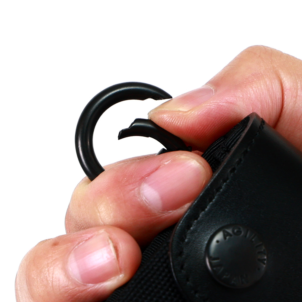 - サイドにはリングカラビナ付き。バッグから下げるほか、ネックストラップを取り付けることもできます。