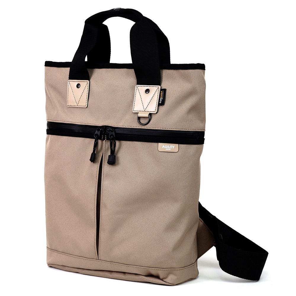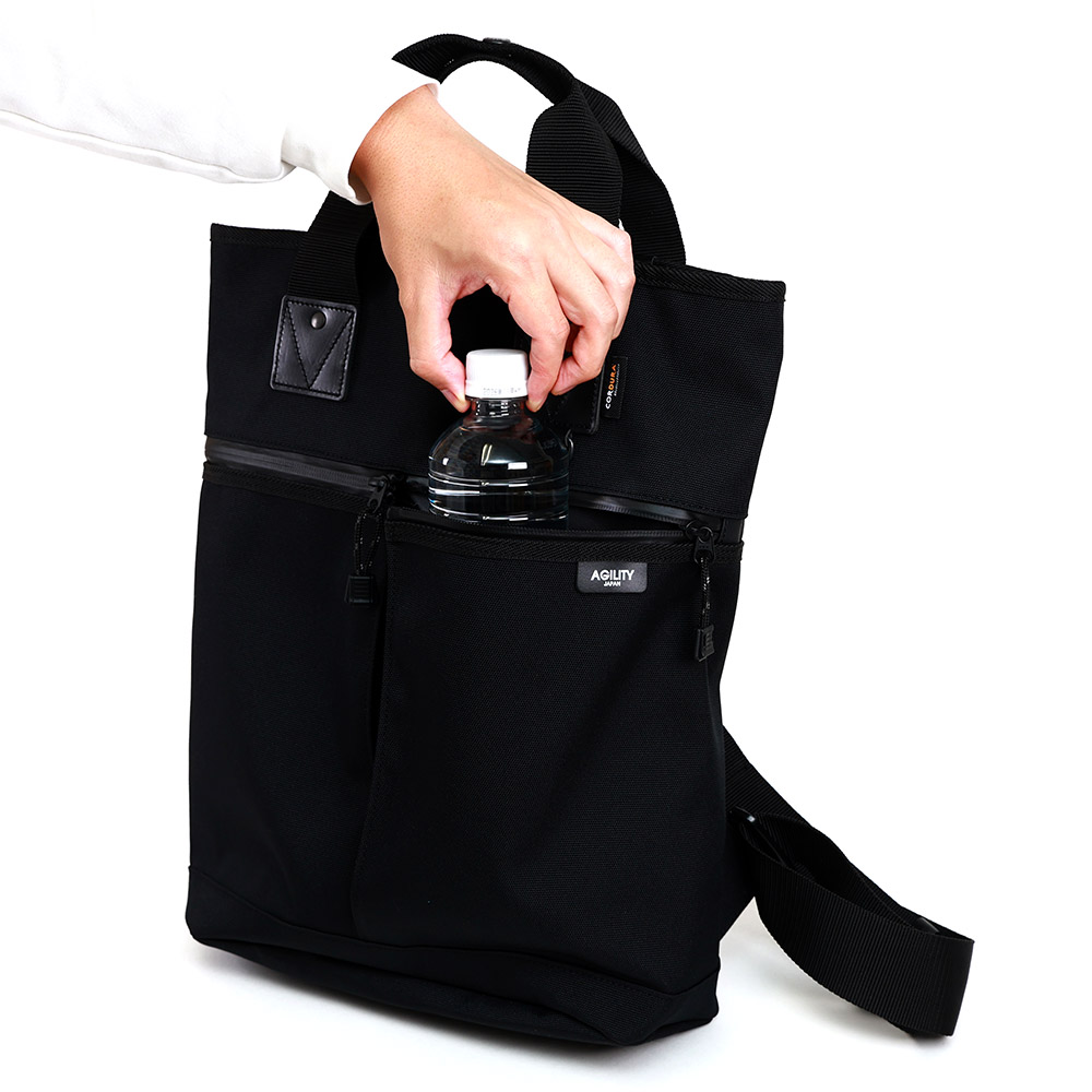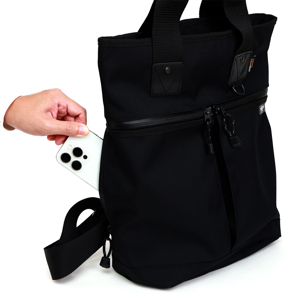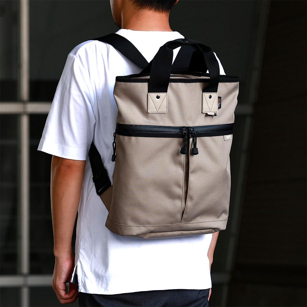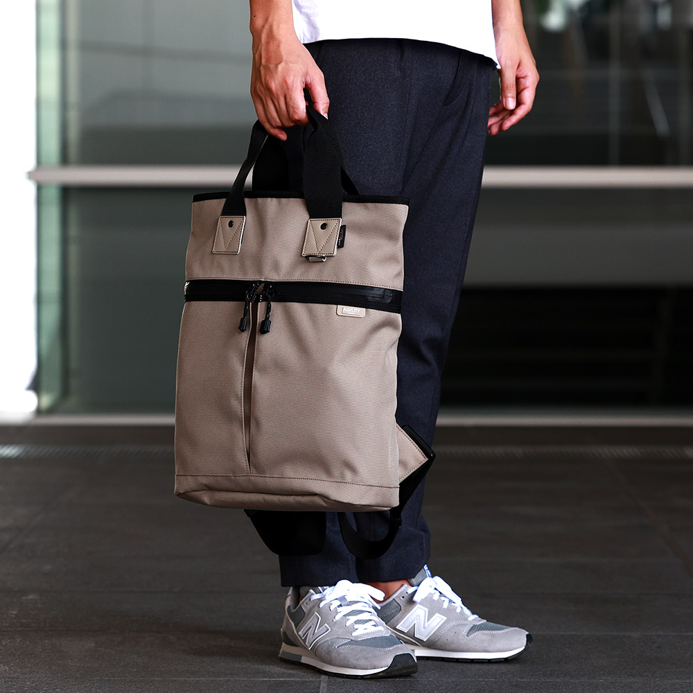撥水素材コンビで雨にも強い2WAYトートリュックです。 【タフ×機能性】武骨なワークテイストを撥水ハイテク素材のコンビで都会的なイメージに仕上げています。 ヘルメットバッグからインスピレーションをうけた縦型のフォルムが特徴。 トートバッグとリュックの2WAYでスタイルを変えて使うことができます。 大きな2つの外ポケットは、ファスナー口の上までが空洞になっているので背の高い折りたたみ傘やボトルも余裕で入ります。 左側の外ポケットは脇部分にも中でつながっているファスナー口があり、リュックを背負った状態からも完全におろさずにアクセスができます。スマホなどの出し入れに便利です。本体はA4サイズが縦に収まるサイズ。 インナー後ろ側には小物が分けて収納できる2つのポケットがついています。2本の持ち手はボタンで固定できます。右側の持ち手付け根にはDカンがついていて、メランジュシリーズの小物などを自由にぶらさげて機能性をカスタマイズできます。 ■素材:ナイロン・牛革/■サイズ:W35×H40×D12.5(cm)/■重量:約500g/■日本製 【リュック / トートバッグ / 撥水 / A4 / ペットボトル / バックパック / 汚れに強い / 縦 / 持ち手】