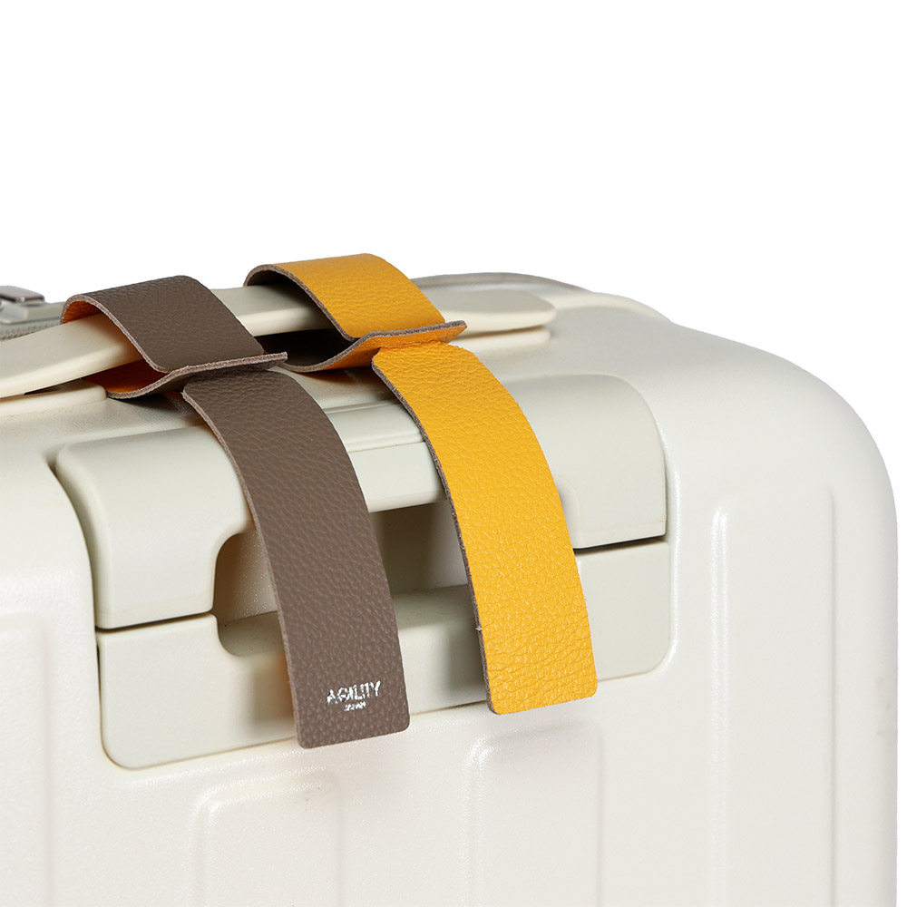 スーツケースのハンドルに取り付ける、シンプルなラゲッジタグです。 T字型の切り込みに反対側の先端を通すだけで、ハンドルに固定できます。 金具を使用していないため、スーツケース本体を傷つける心配がなく本体も10gと非常に軽量です。 バイカラーが特徴でAGILITYのロゴがワンポイント。 単なる識別用タグとしてだけでなく、アクセサリーとしても最適な一品です。 遠くからでも一目で自分のバッグを判別できる「旅の目印」として活躍します。 ■素材:牛革/■サイズ:W3.3 × 全長24(cm)/■重量:約10g/■日本製 【バイカラー / ラゲッジタグ / タグ / ラゲッジ / スーツケース / 本革 / レザー / おしゃれ 】 [0879pd][08799220][08799221][08799222]