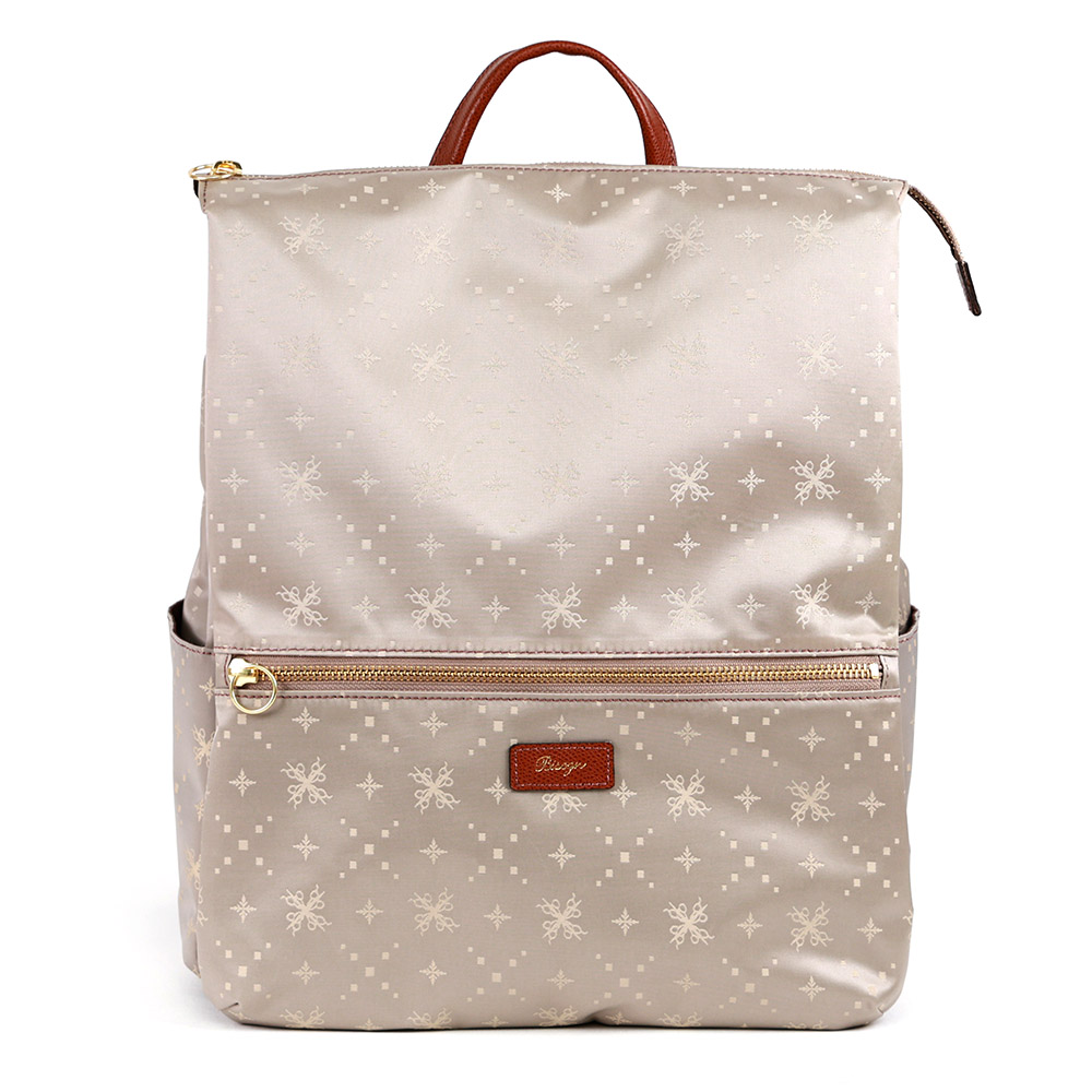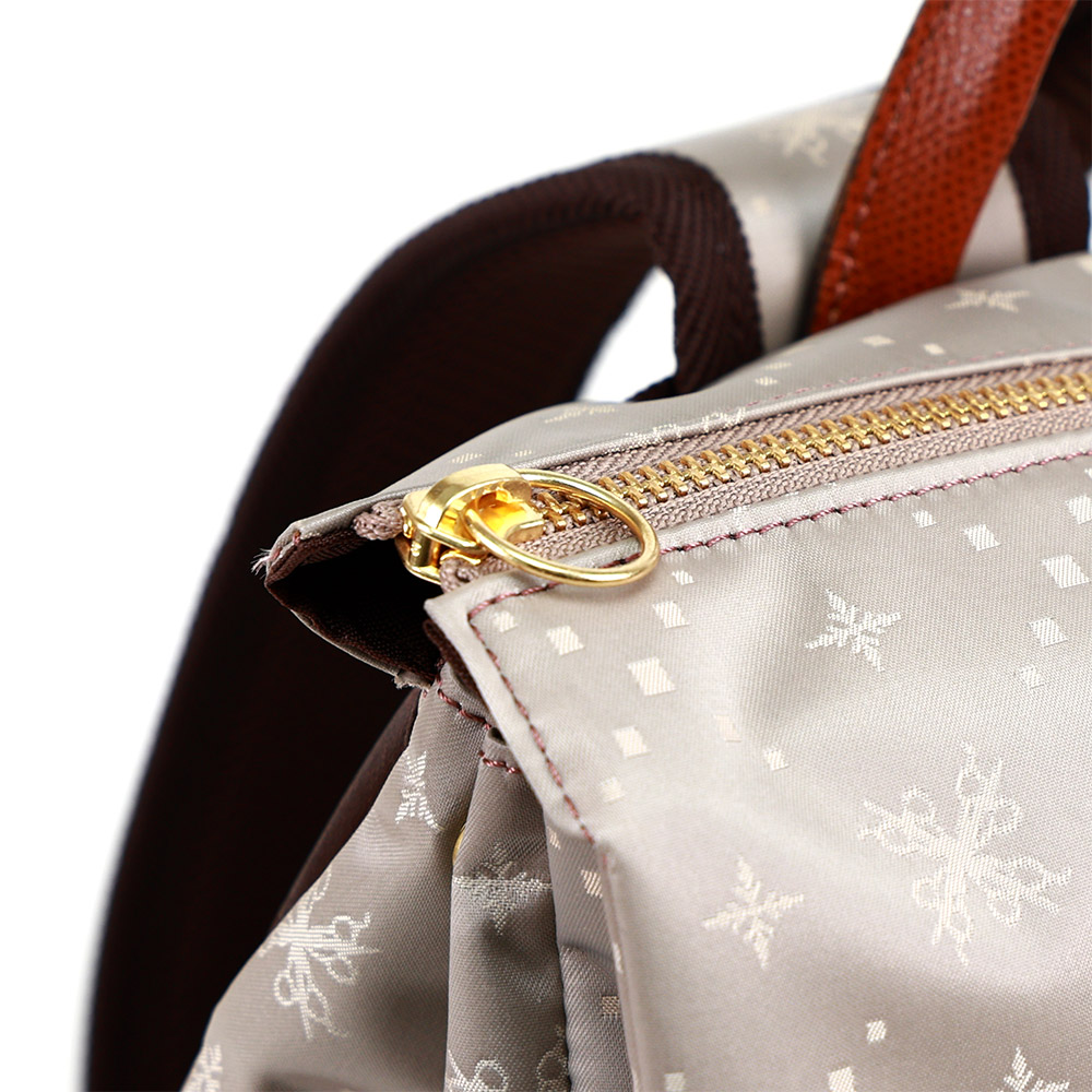 - ファスナーには、開閉しやすいリング状の引き手を 付けました。上部の持ち手には撥水レザーを使用。