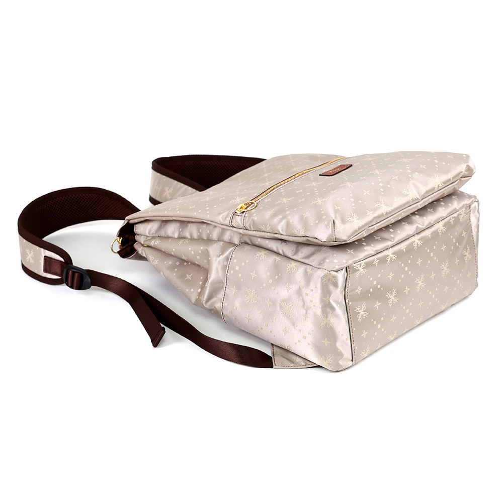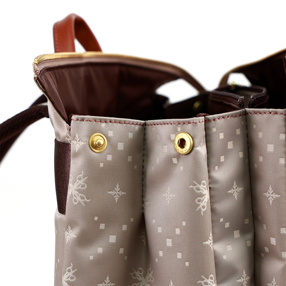 - 開口部の両脇にはスナップボタンが付いているので 荷物を出し入れするときは、口を大きく開けられます。