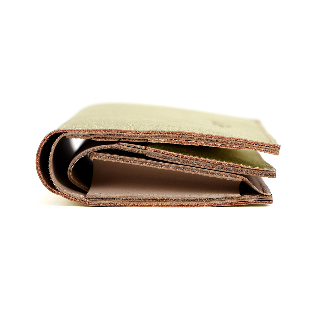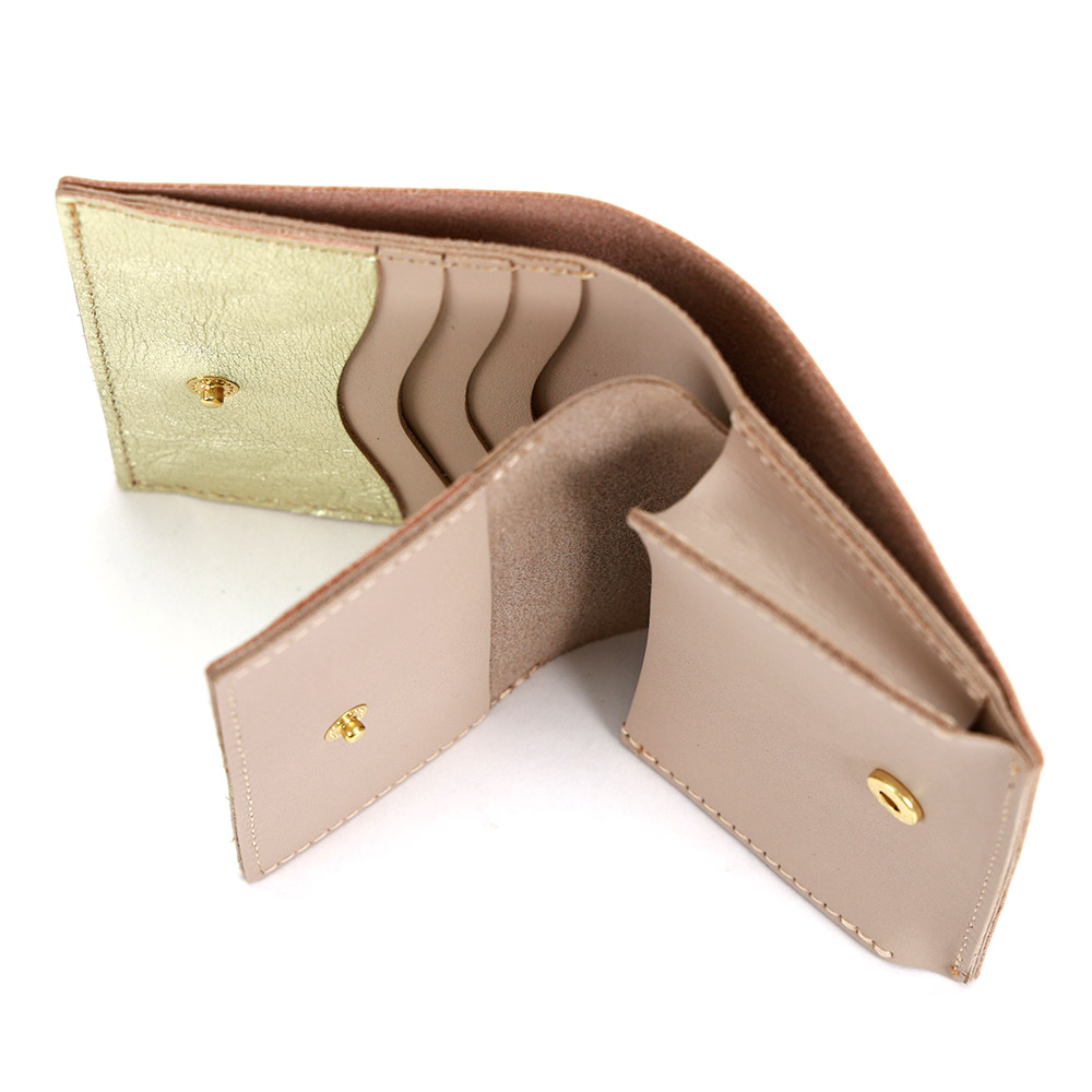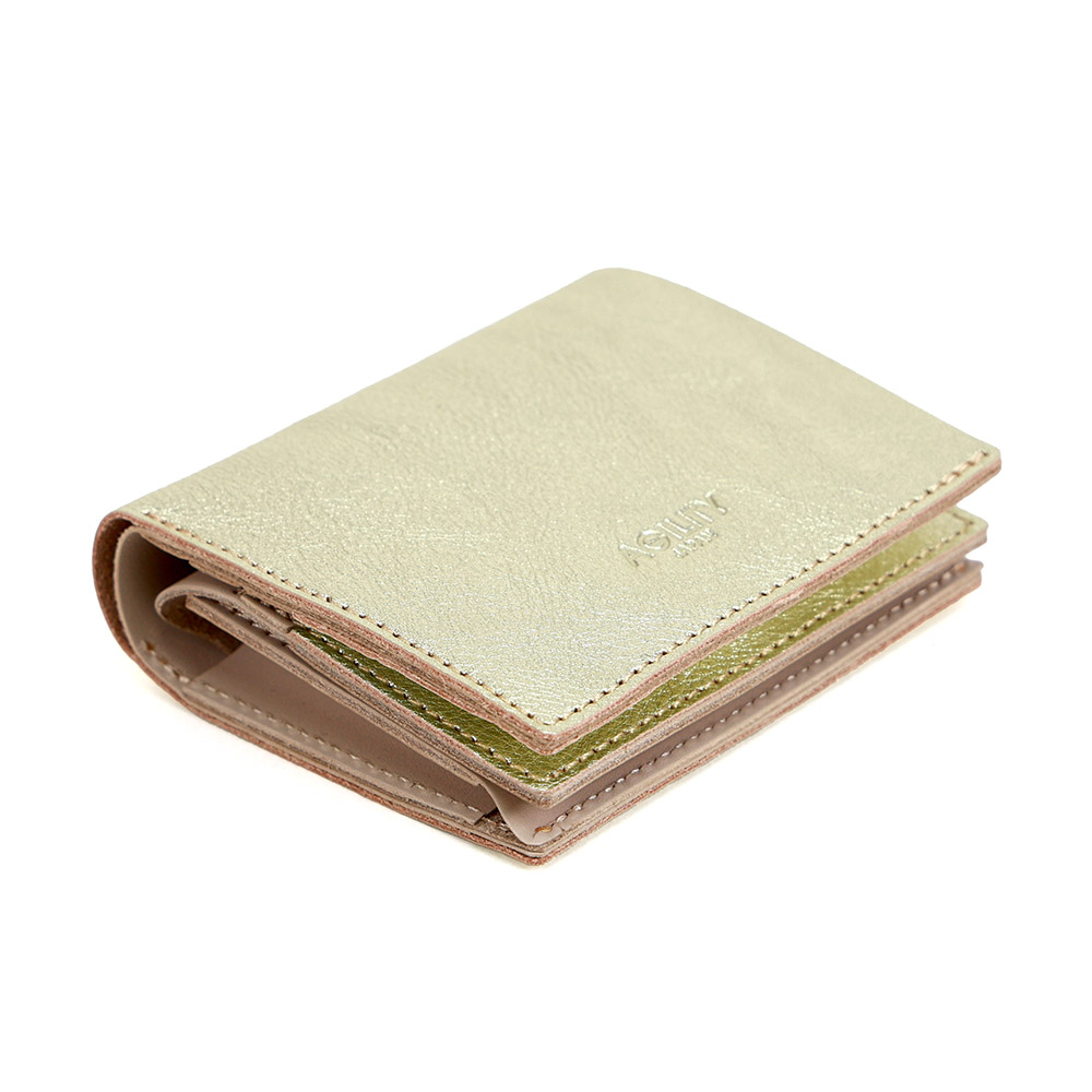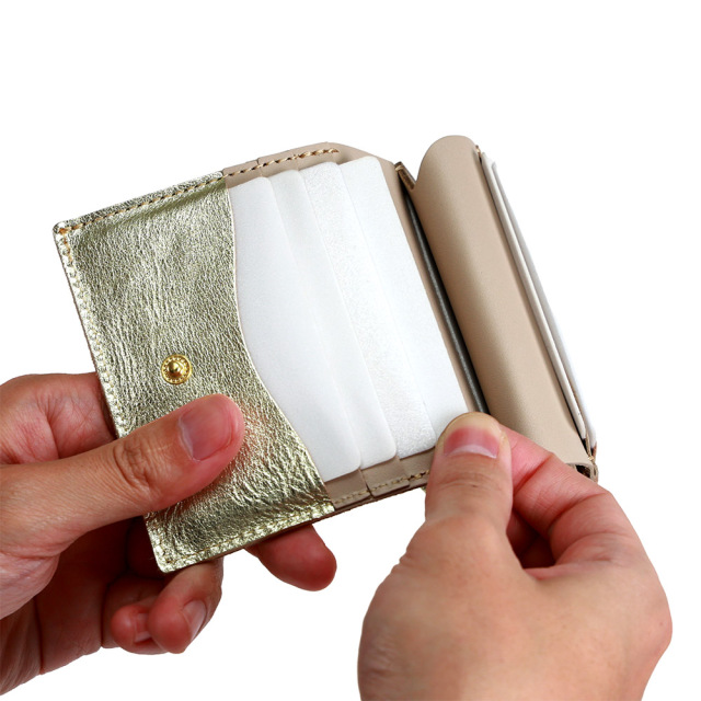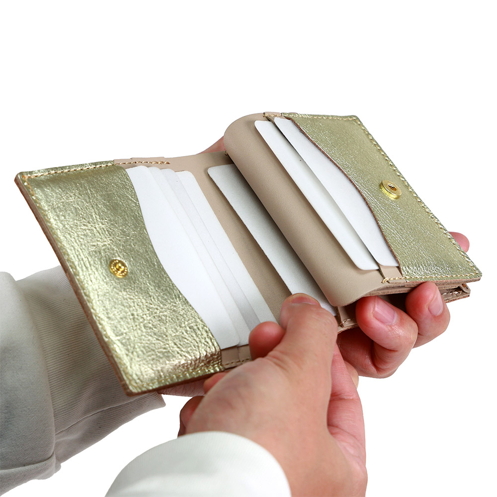 植物タンニンでなめした牛キップをベースに、東京の工場で加工した革です。革の表面を箔加工した後に、タイコと呼ばれる大きなドラムに水と一緒に入れて回し、革を縮めて表面にシュリンクを作っていきます。箔加工は革らしくないイメージがありますが、この革はタンニン鞣しとシュリンク加工をすることで、革らしい仕上がりになっています。 【注意】箔加工の性質上、度重なる擦れや強い摩擦などによって使用していくうちに箔が剥がれることがあります。予めご了承ください。
