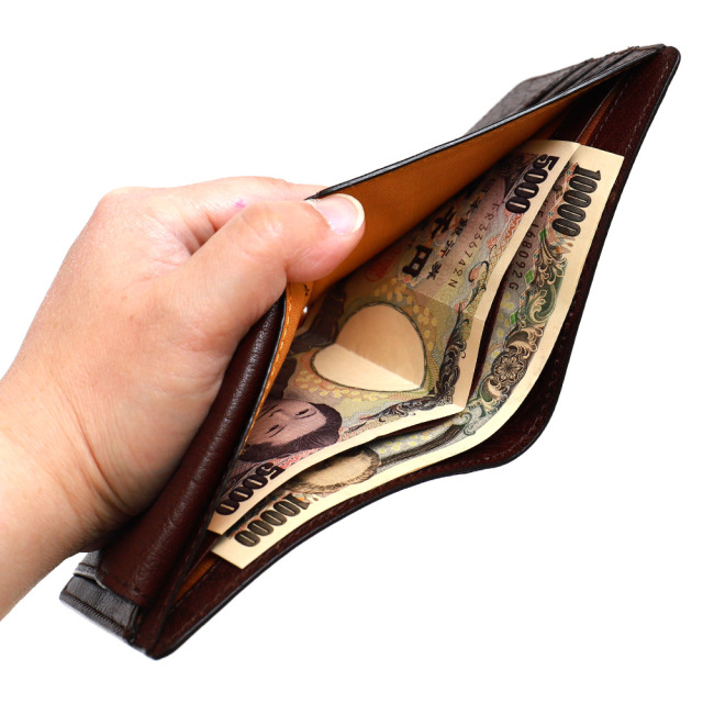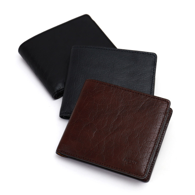 水牛の革のことをバッファローと呼びます。家畜革として流通している代表的な皮革≪羊・山羊・牛・水牛≫の中で、吟面(革の表面)の強度がダントツに高いのが特徴です。またバッファローは背中、脚、首、お腹回りなど部位によって表情が大きく変わります。ベースの鞣しはクロムとタンニンのコンビなめしで、クロム鞣しの特性である丈夫さ、耐久性を持ちつつ、タンニン鞣しの特性である経年変化を味わえます。染色の際、革の上に顔料を垂らし、紙漉きの要領で革を揺らすことで、凹部分に顔料が多く入り色ムラや濃淡が生まれます。特殊な染色方法を用いることで、独特な奥行き深い色合いを表現しています。こうして生まれた色ムラは、偶然の産物であり、同じものは二つとない、全てがオンリーワンの商品となります。