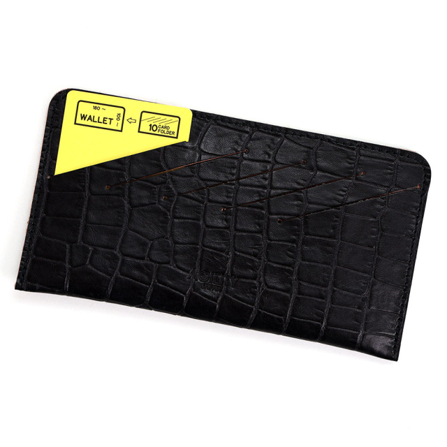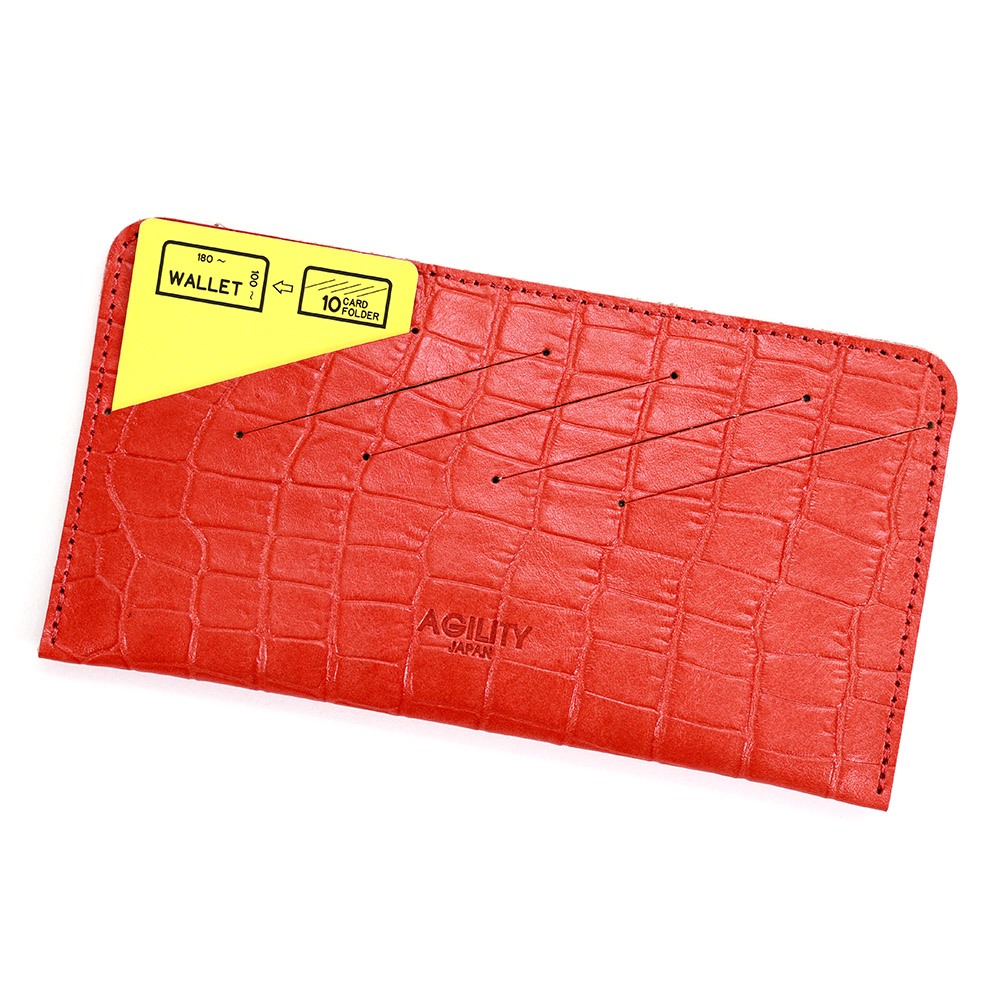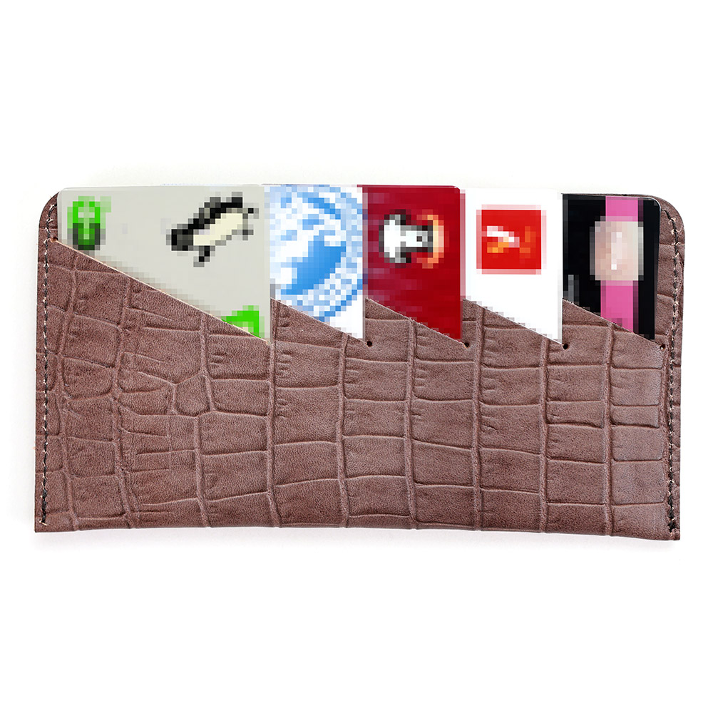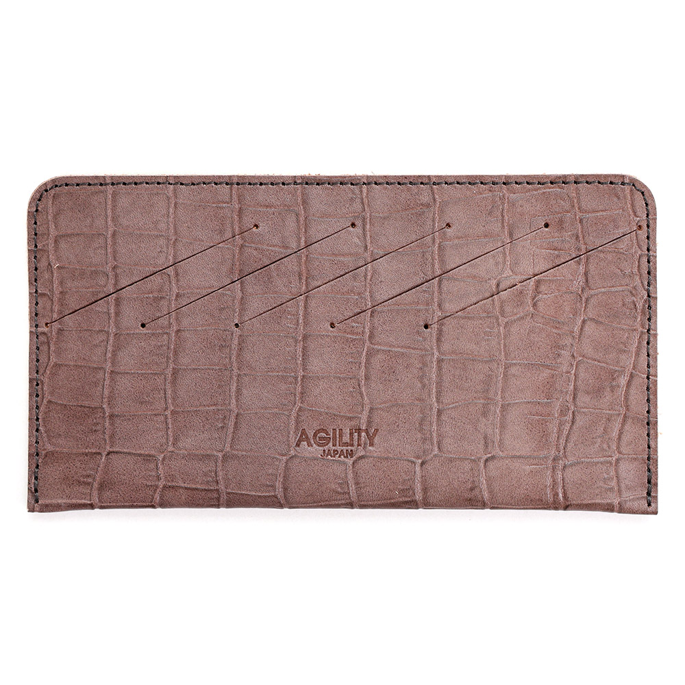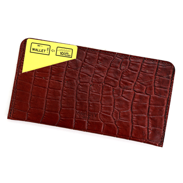<クロコダイル型押し牛革>墨田区の染革工場カナメで仕上げた革です。タンニンでじっくりと鞣した牛キップに、下色をつけてからクロコダイルの型を型押し(エンボス)します。その上に熟練した職人が染料を手吹きで染め上げさらに頭ハリというツヤをいれる工程で型押しに立体感をだしていきます。使っていくとより一層深い色に変化していくエイジングを愉しめる革です。