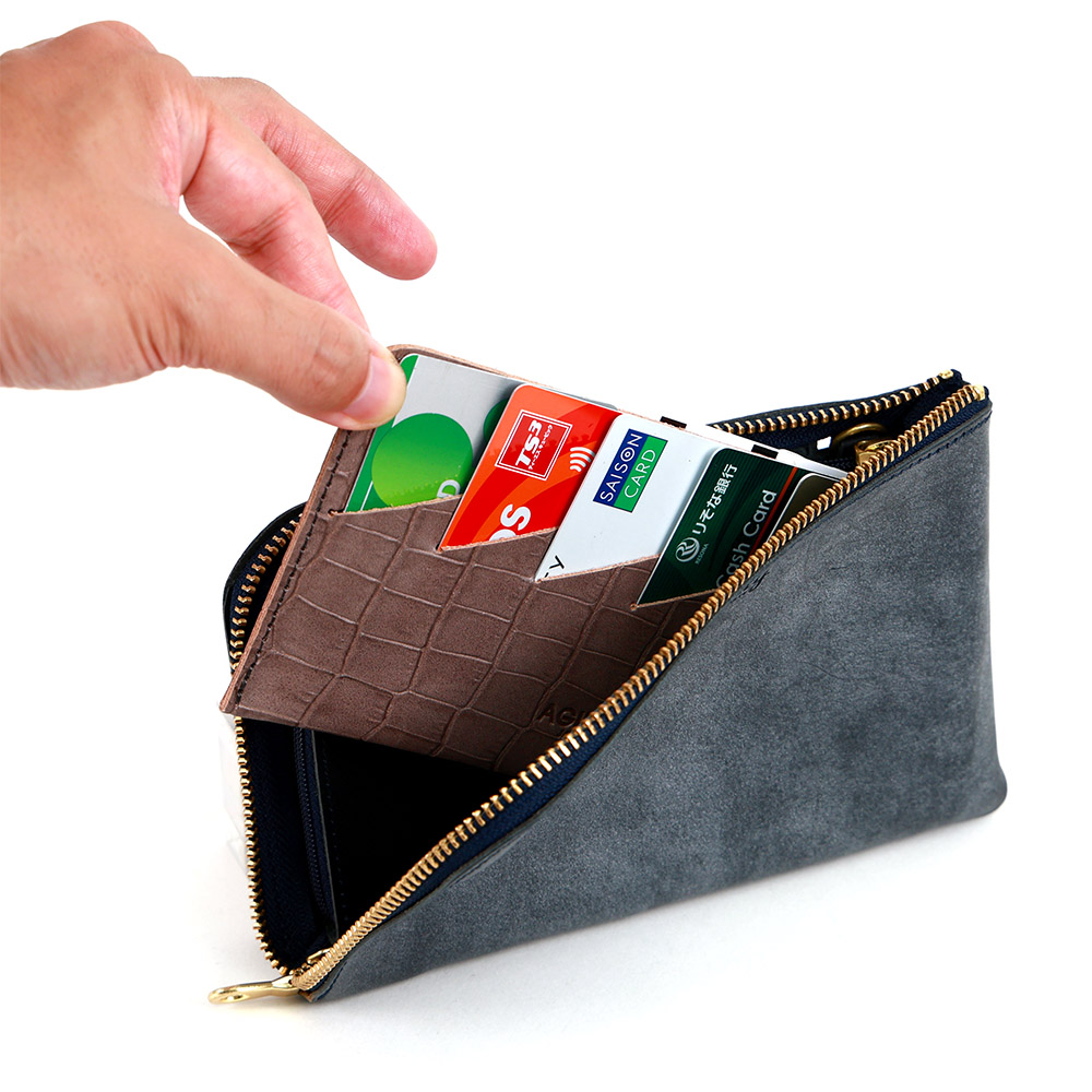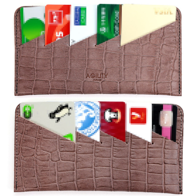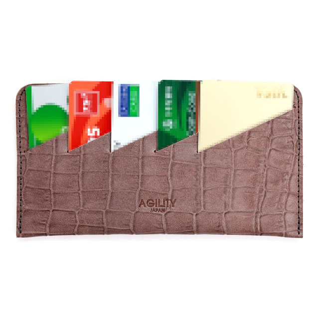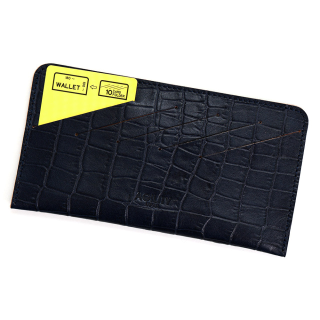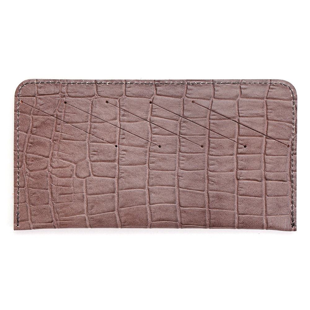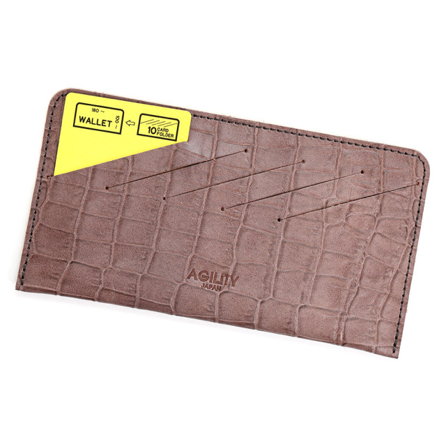 <クロコダイル型押し牛革>墨田区の染革工場カナメで仕上げた革です。タンニンでじっくりと鞣した牛キップに、下色をつけてからクロコダイルの型を型押し(エンボス)します。その上に熟練した職人が染料を手吹きで染め上げさらに頭ハリというツヤをいれる工程で型押しに立体感をだしていきます。使っていくとより一層深い色に変化していくエイジングを愉しめる革です。