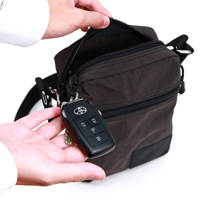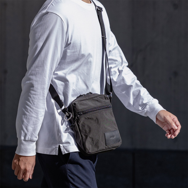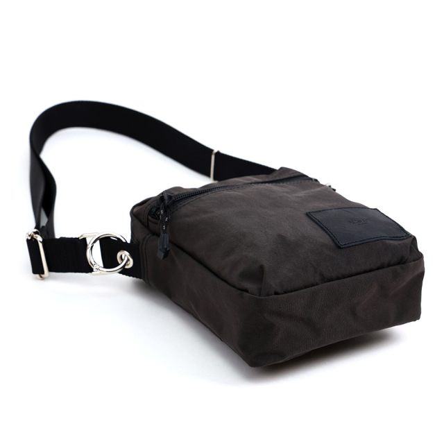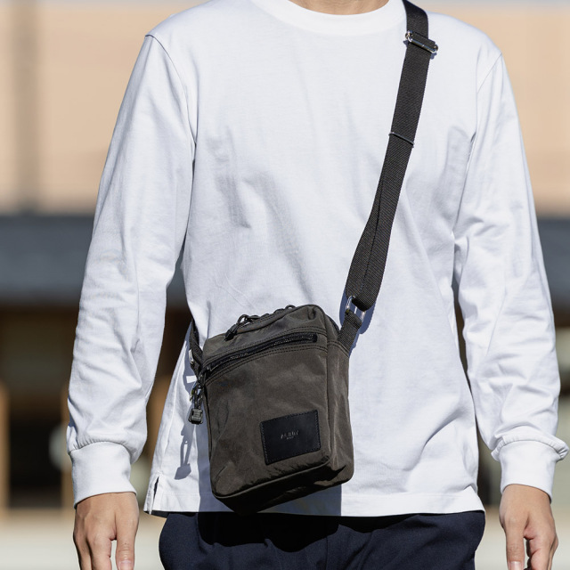 塩縮加工を施し、和紙のようなドライなタッチ感が特徴のシワナイロンです。塩縮加工とは、繊維を特殊な薬品で膨潤させることで糸に膨らみを持たせ、繊維の体積が増えることで、その分生地が縮んで詰まったような風合いに 仕上げすることが出来る加工です。生地の密度を上げることで、通常のナイロンよりも強度があります。タスラン加工糸(撚りをかけないふっくらと柔らかな質感が特長の糸)を使用しており、綿ライクな仕上がりで帆布のよう見みえますが、とても軽いのも特徴です。