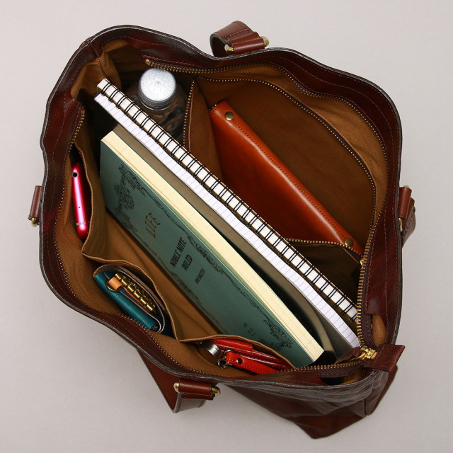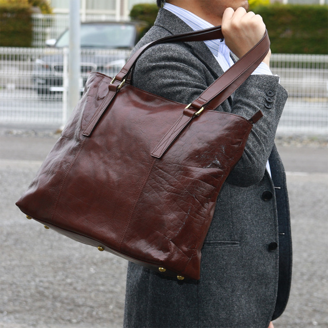 水牛の革のことをバッファローと呼びます。家畜革として流通している代表的な皮革≪羊・山羊・牛・水牛≫の中で、吟面(革の表面)の強度がダントツに高いのが特徴です。またバッファローは背中、脚、首、お腹回りなど部位によって表情が大きく変わります。ベースの鞣しはクロムとタンニンのコンビなめしで、クロム鞣しの特性である丈夫さ、耐久性を持ちつつ、タンニン鞣しの特性である経年変化を味わえます。染色の際、革の上に顔料を垂らし、紙漉きの要領で革を揺らすことで、凹部分に顔料が多く入り色ムラや濃淡が生まれます。特殊な染色方法を用いることで、独特な奥行き深い色合いを表現しています。こうして生まれた色ムラは、偶然の産物であり、同じものは二つとない、全てがオンリーワンの商品となります。【アフターケア】原皮の段階からオイルを十分含んでいるため、基本的なケアは乾拭き程度で構いません。使い込んで革の乾燥が気になるようになったら、皮革用のワックスや保護クリームを適宜塗布してください。オイルを入れ過ぎると、革が柔らかくなり過ぎる場合があるので、使用量にご注意ください。