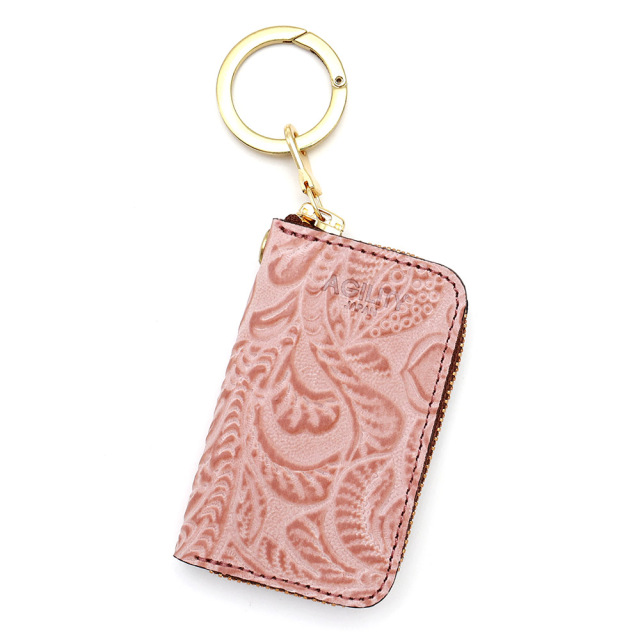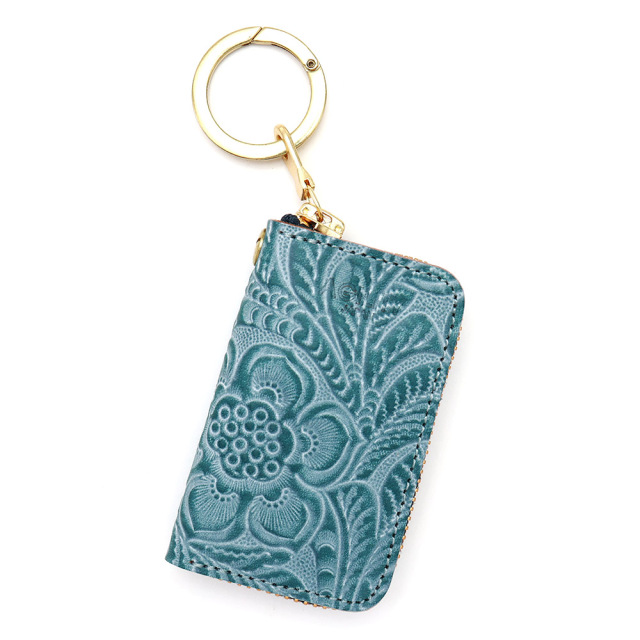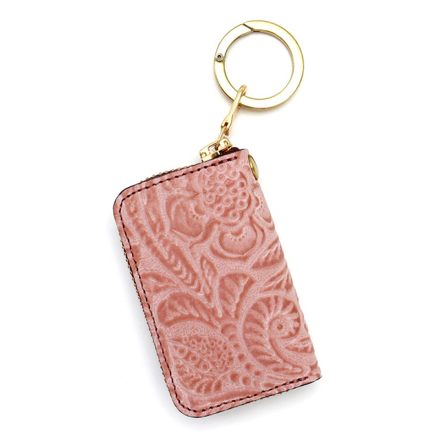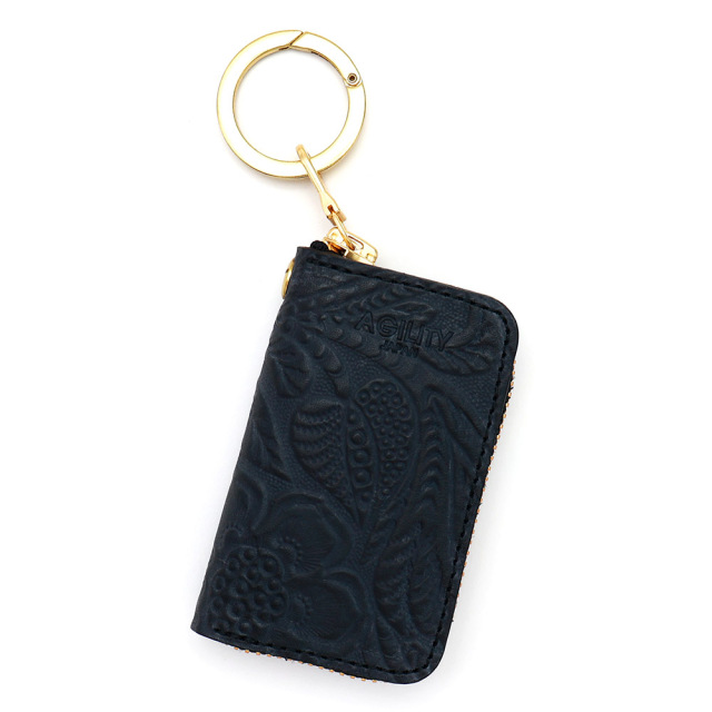 タンニンでじっくりと鞣した牛キップに、墨田区の染革加工場で下色をつけてからフラワーの型を型押し(エンボス)した革です。その上に熟練した職人が染料を手吹きで染め上げ、さらに頭ハリという工程で白いパラフィンをのせ、型押しに立体感をだしています。使っていくと艶があがり、より一層深い色に変化していくエイジングを愉しめます。機械ではなく職人の手で染色、加工をしているので個体差が生まれそれが特徴となっている革です。