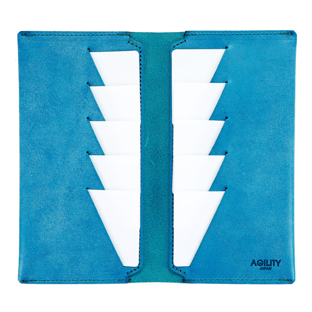 商品説明: 小銭は別持ち派におすすめな極薄長財布。「カードフォルダー」の構造を生かし、革に斜めスリットを入れたカードポケットにすることで革の重なりを抑え、極薄に仕上げました。カードが重ならず出し入れしやすい間隔・角度にカッティングを入れています。左右にそれぞれ5枚のカードが収納可能です。左右カードポケットの裏のスペースには紙幣がそれぞれ10枚程度収まります。お札以外にも、カードやレシートなど入れておくことができます。 ■素材:牛革/■サイズ:W9.5 × H18 × D1(cm)/■重量:約80g/■日本製 【長財布 / 折財布 / カード / お札 / シンプル / 薄型 / 10枚 / 内ポケット / 本革 / レザー / ターコイズブルー】