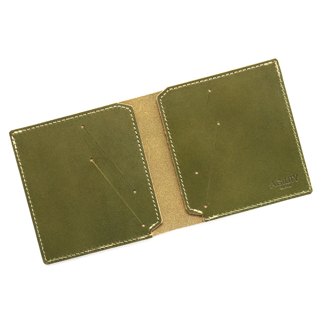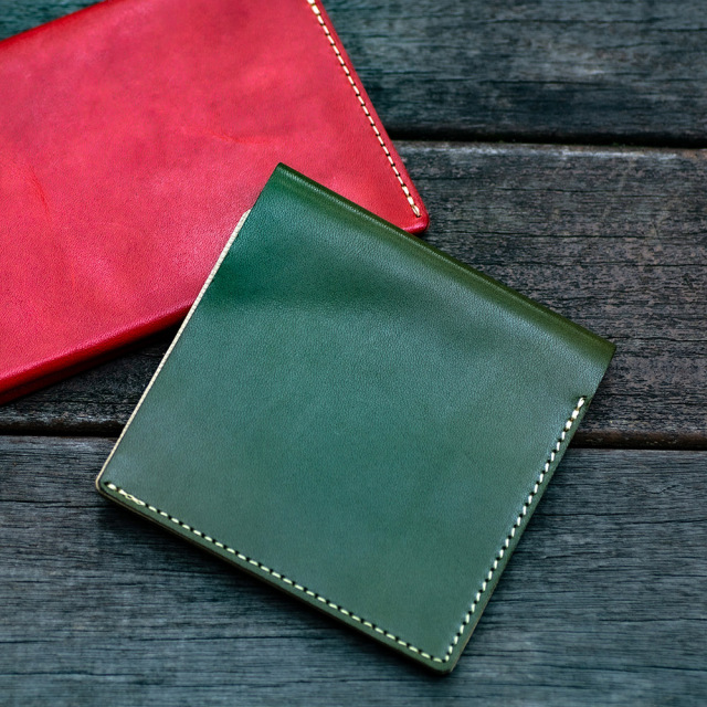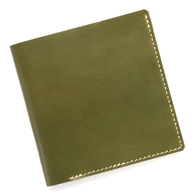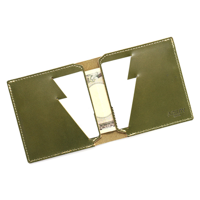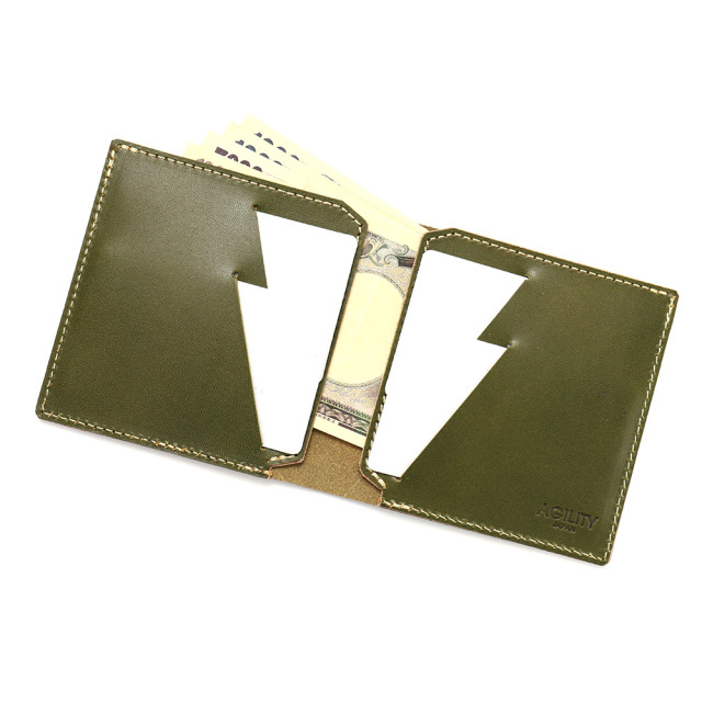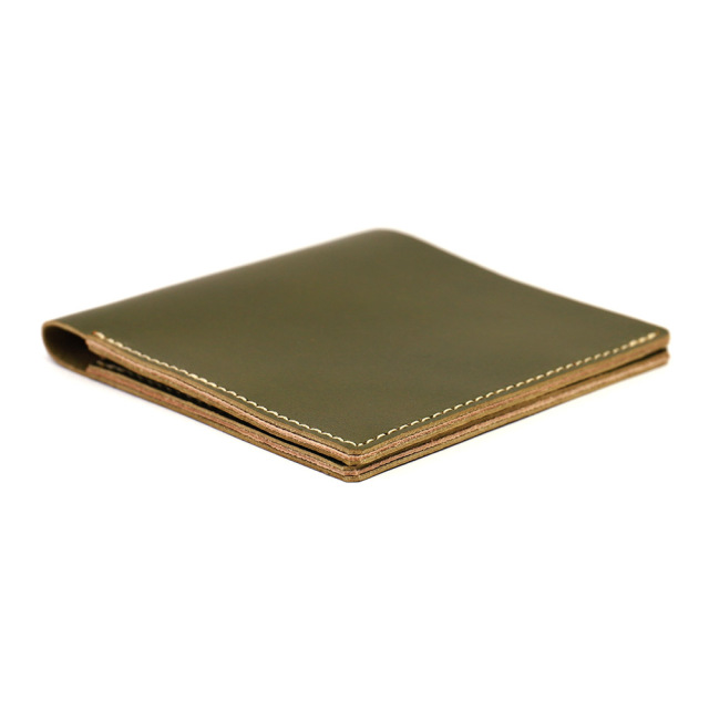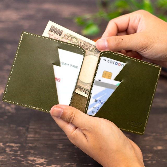 商品説明: 胸ポケットにもスッと収まる極薄2つ折り財布。「カードフォルダー」の構造を生かし、革に斜めスリットを入れたカードポケットにすることで革の重なりを抑え、極薄に仕上げました。カードが重ならず出し入れしやすい間隔・角度にカッティングを入れています。左右にそれぞれ2枚のカードが収納可能です。左右カードポケットの裏のスペースには紙幣が10枚程度収まります。