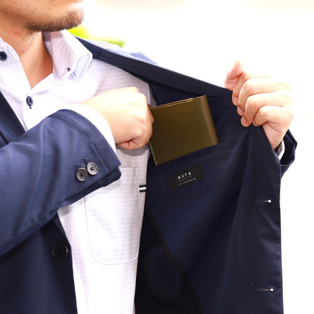 スーツやジャケットの内ポケットにピッタリの大きさ、シルエットが崩れる事もありません。