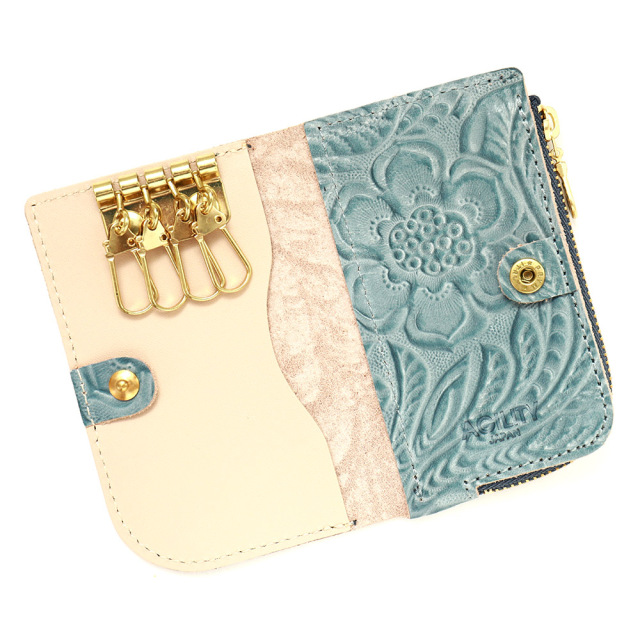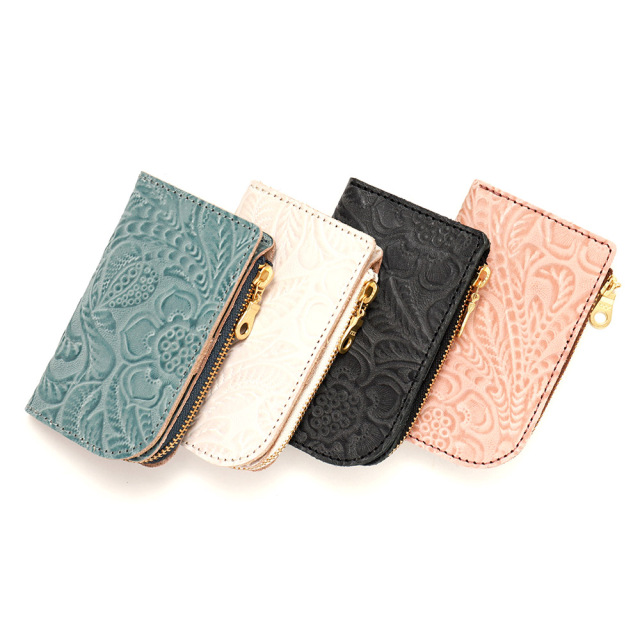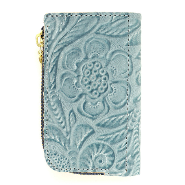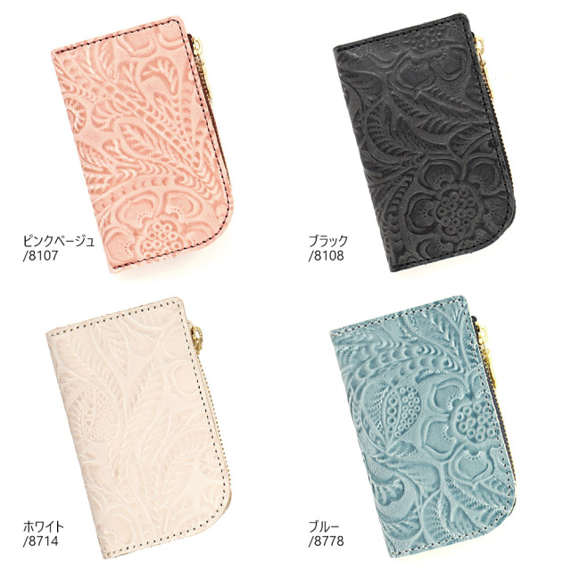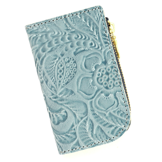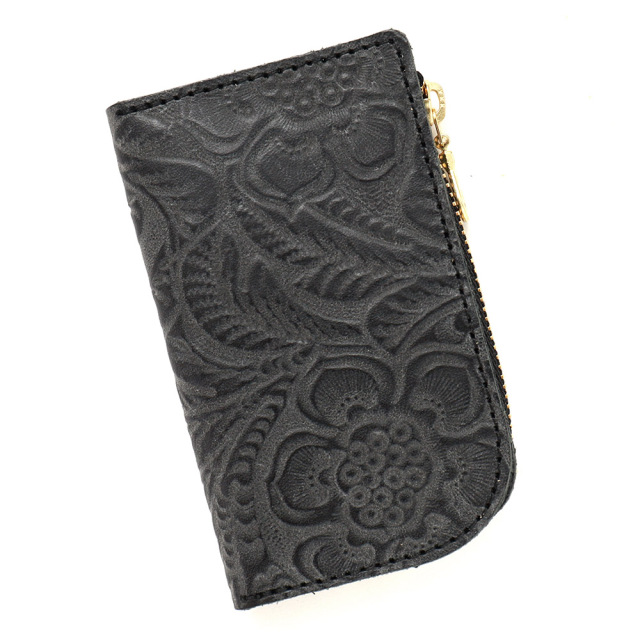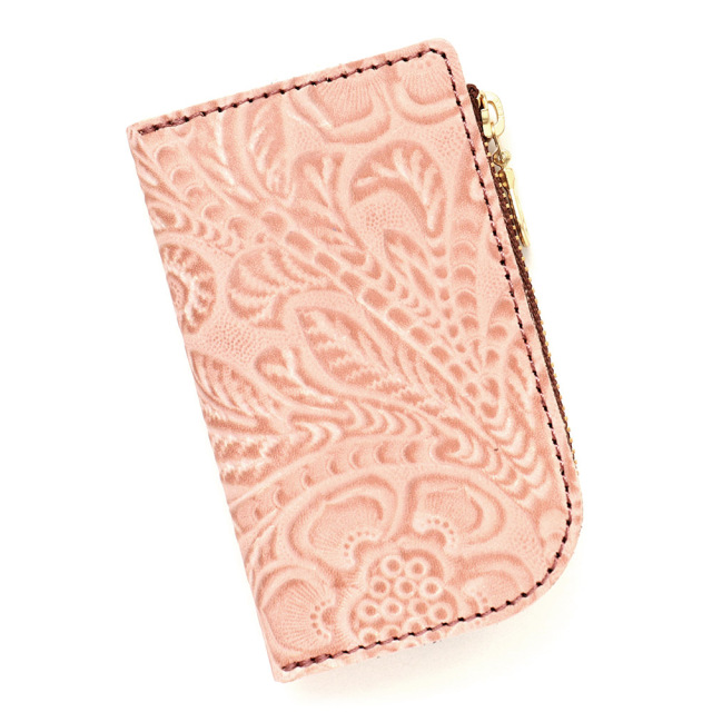 タンニンでじっくりと鞣した牛キップに、墨田区の染革加工場で下色をつけてからフラワーの型を型押し(エンボス)した革です。その上に熟練した職人が染料を手吹きで染め上げ、さらに頭ハリという工程で白いパラフィンをのせ、型押しに立体感をだしています。使っていくと艶があがり、より一層深い色に変化していくエイジングを愉しめます。機械ではなく職人の手で染色、加工をしているので個体差が生まれそれが特徴となっている革です。
