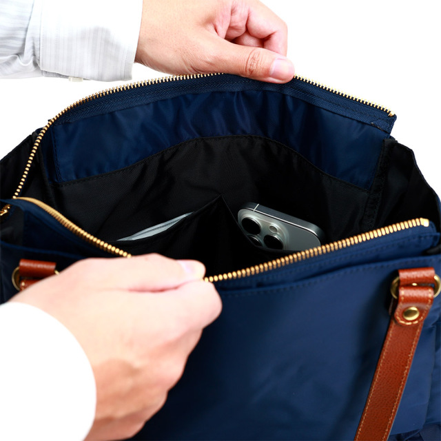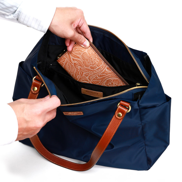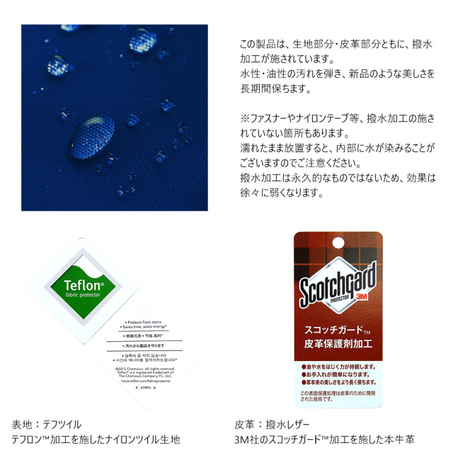 【テフツイル】光沢が美しく軽量なナイロンツイルを土台にテフロン(TM)加工を施すことにより、水性および油性の液体をはじく機能性を兼ね備えました。生地のうえで液体がビーズ状になり、玉のようにころがり落ちます。水滴やちょっとした汚れもさっと拭き取ることができ、新品のような美しさを長く保ちます。(注:テフロン加工の効能は永久ではありません。表面加工なので徐々に落ちていきます。ご了承ください。)