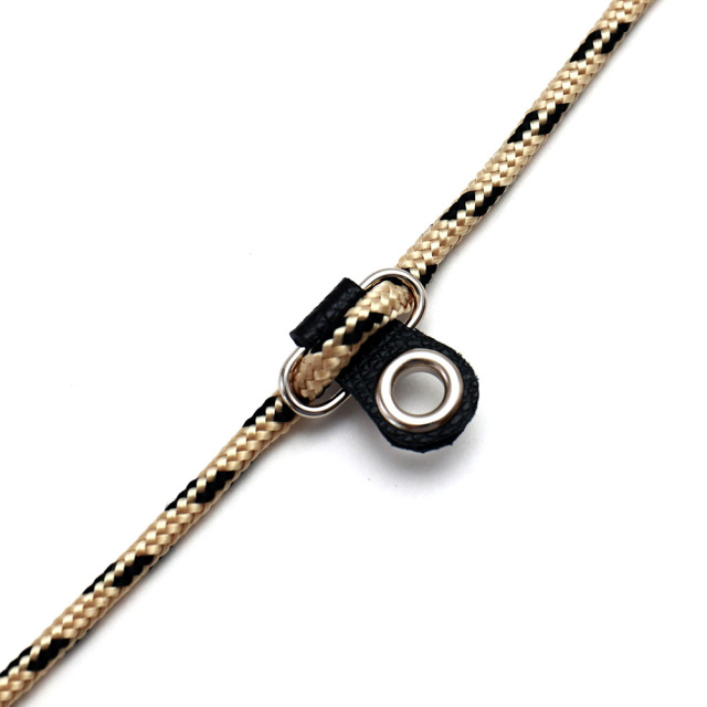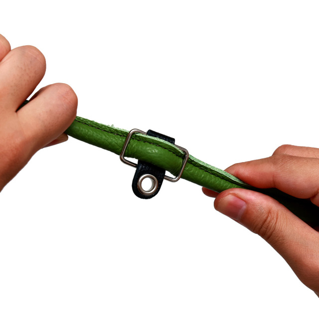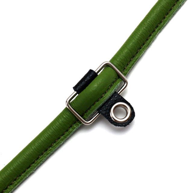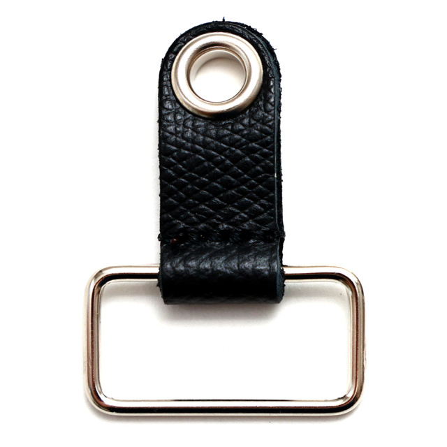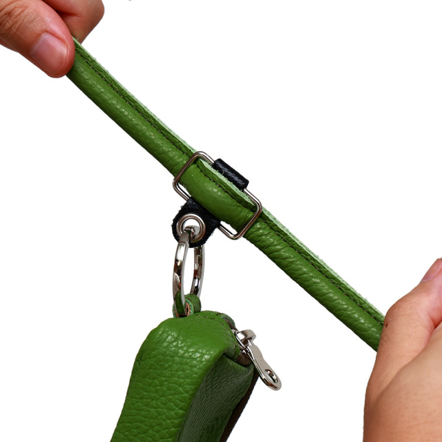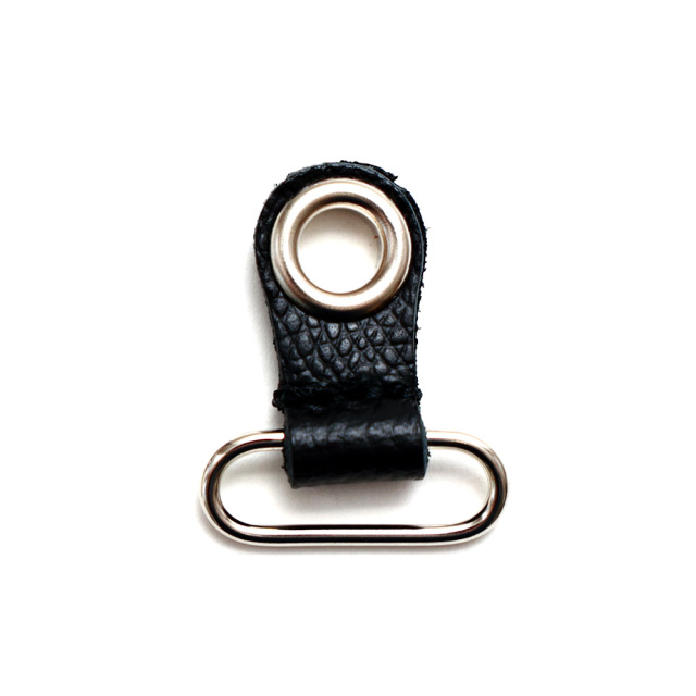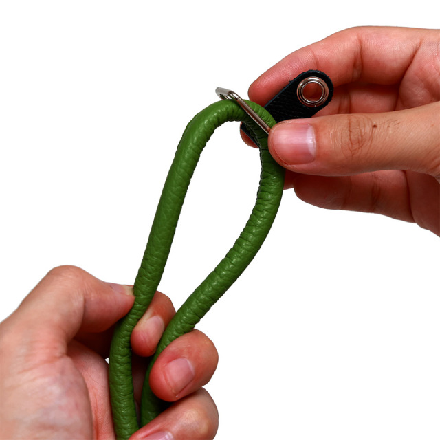 ショルダーベルトの自由な位置にセットし、先端のハトメに革小物などを吊るすことができるようになります。